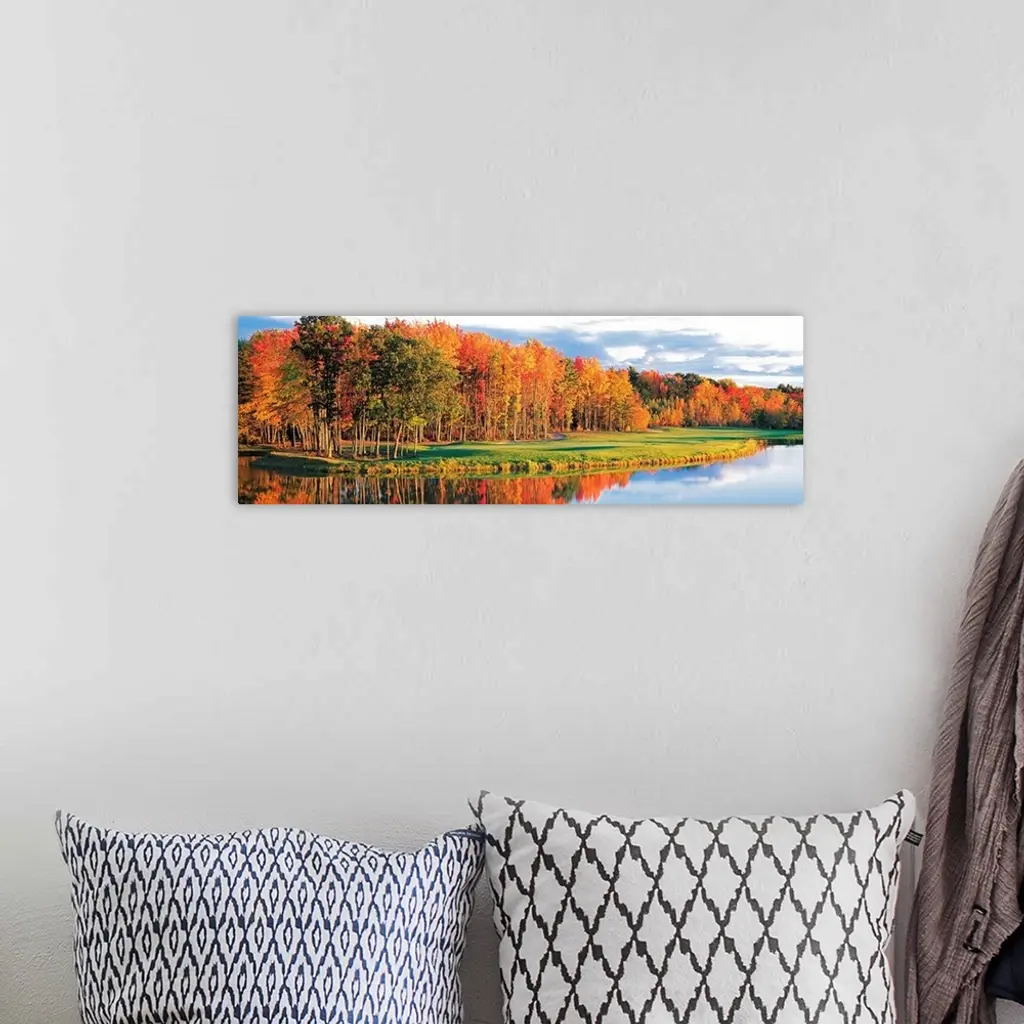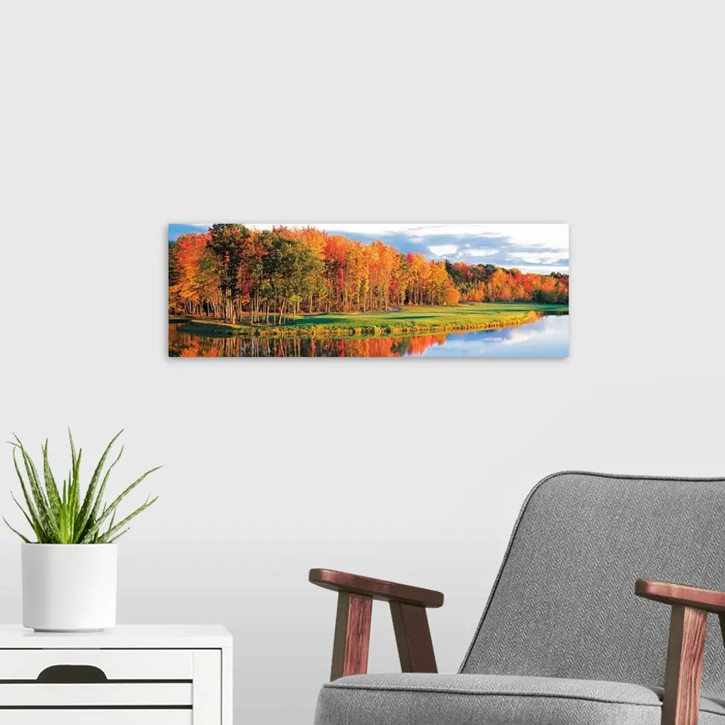 Wide angle photograph of a bright autumn tree line along the waters edge, on a golf course in New England.