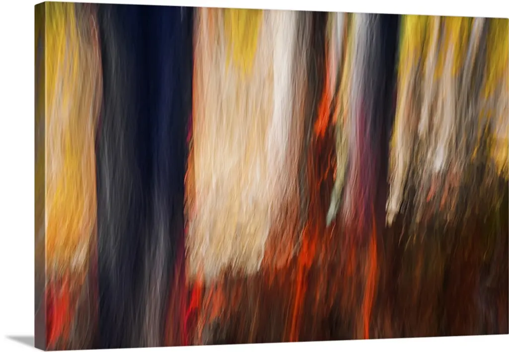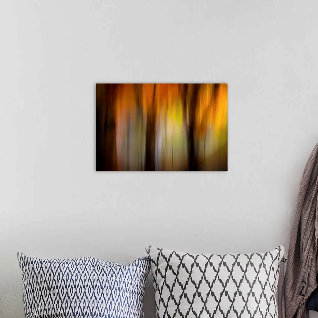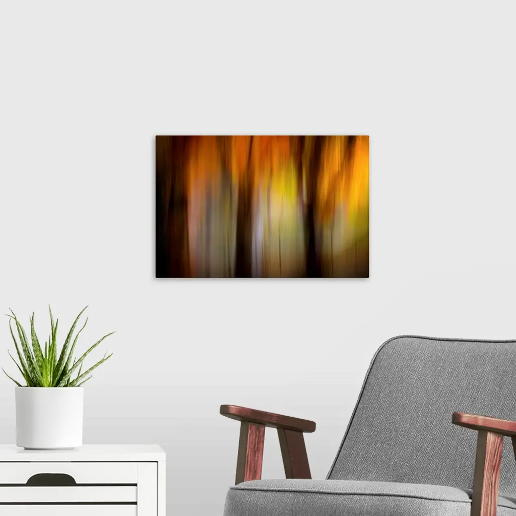 Abstract photograph of an autumn scene in warm, glowing tones, reminiscent of a forest at sunset.