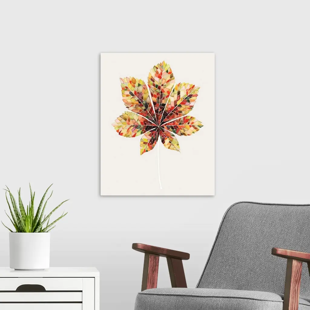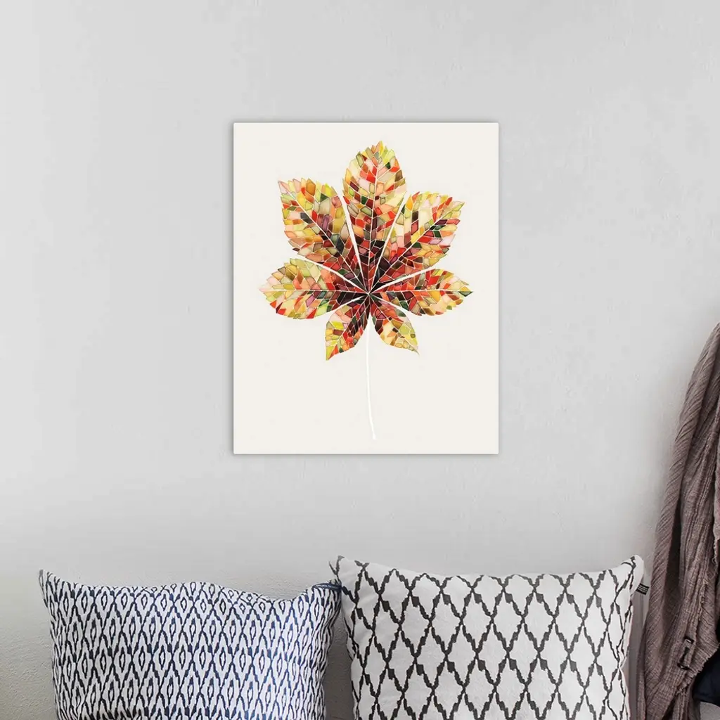 Outline of a leaf with orange and yellow shapes within, resembling a mosaic.