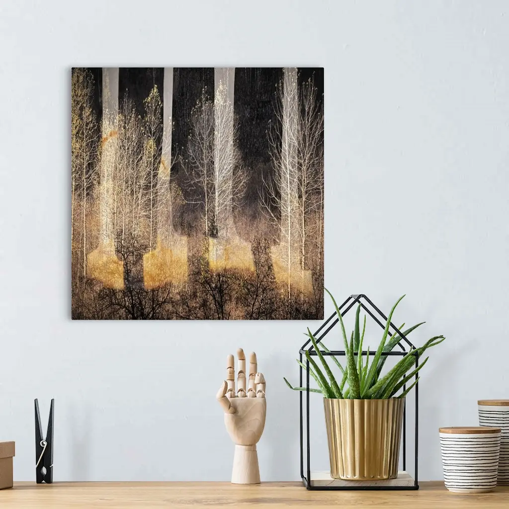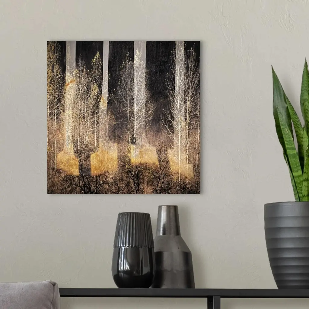 Abstract golden light in a forest of bare trees, resembling piano keys.