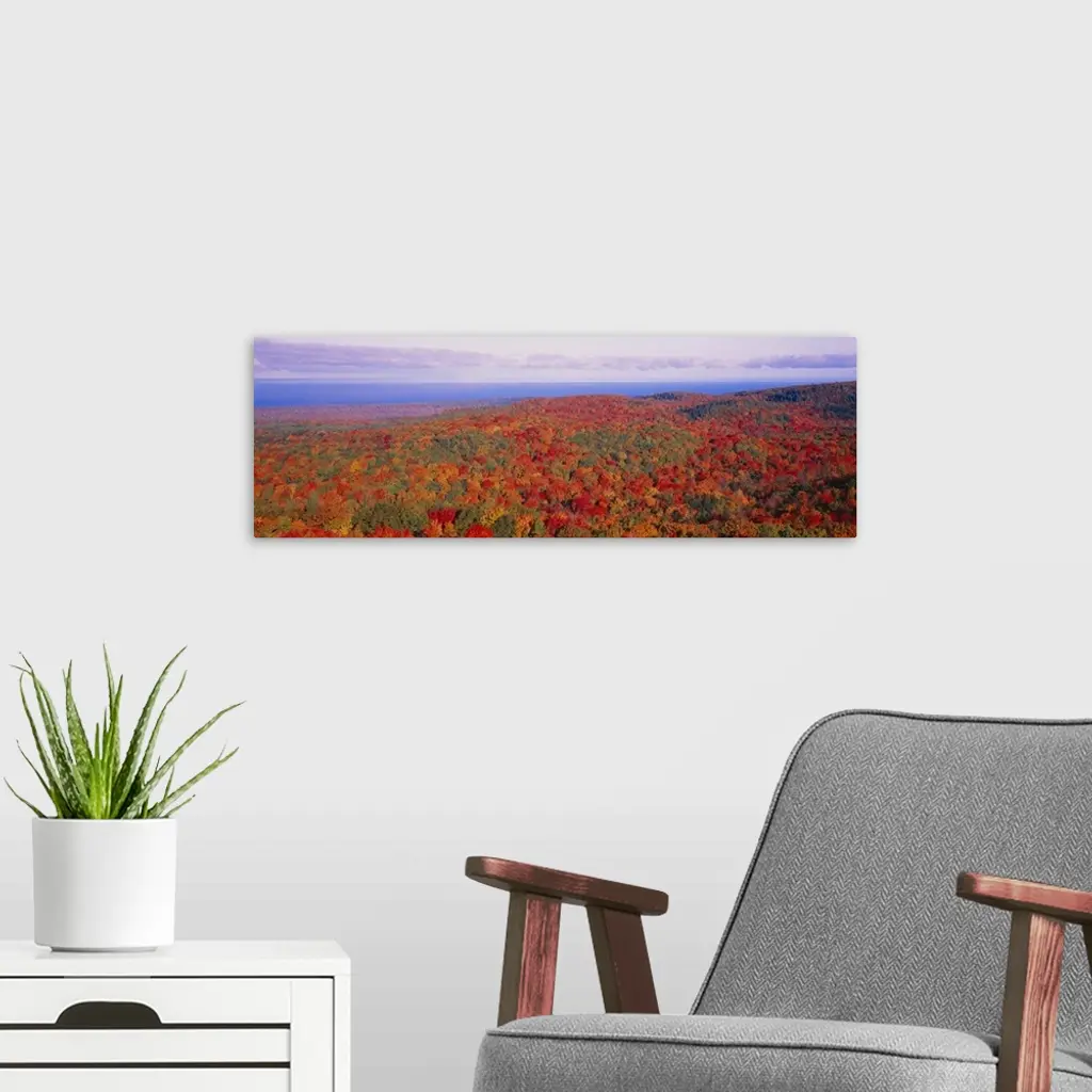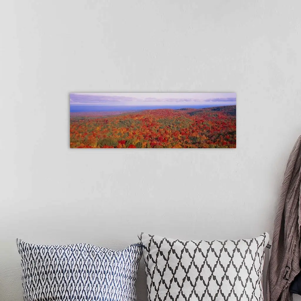 Deciduous forest showing wide array of autumn colors across the hills of Michigan, with a lake in the background.