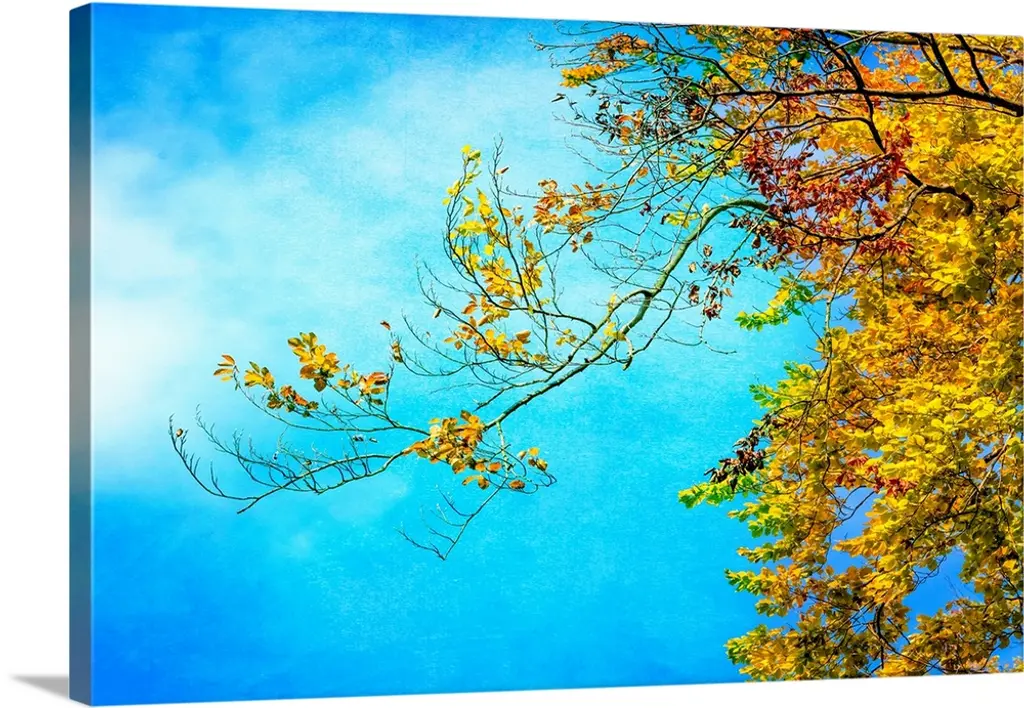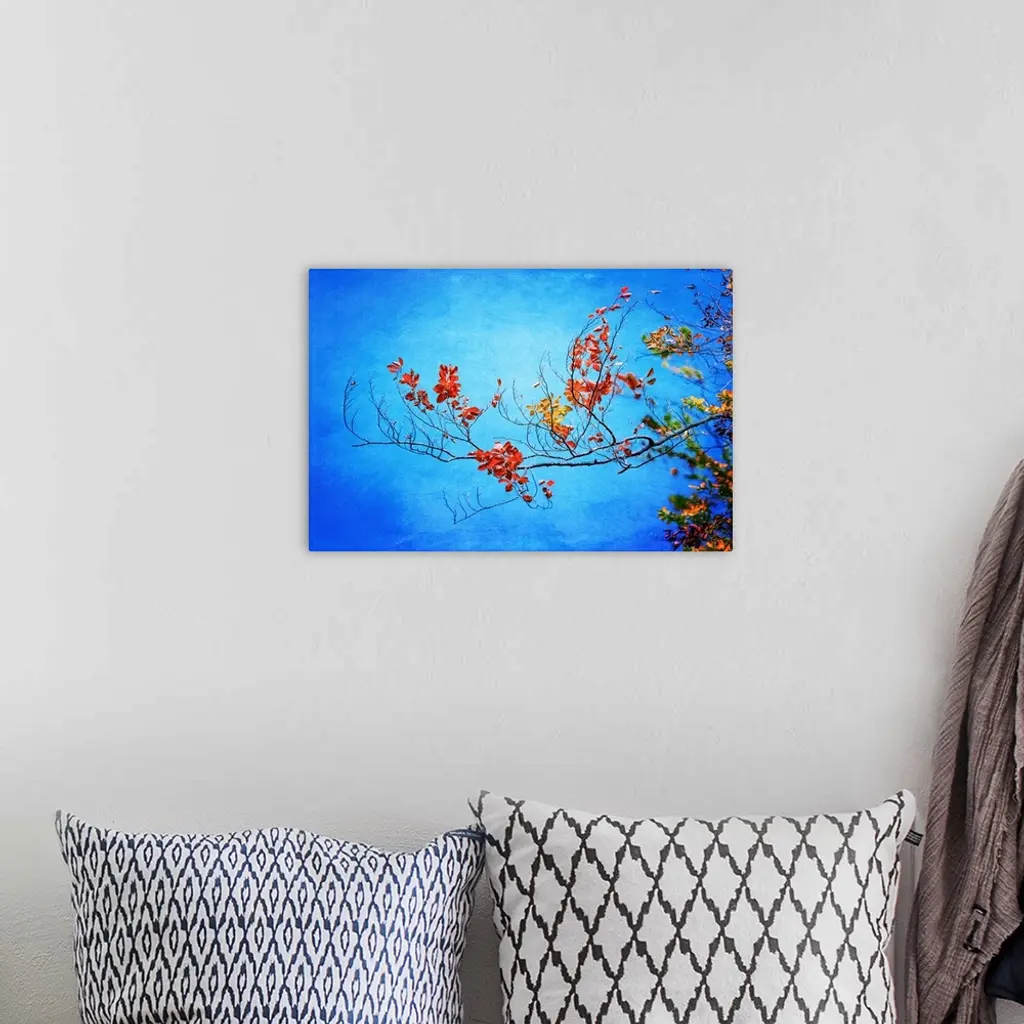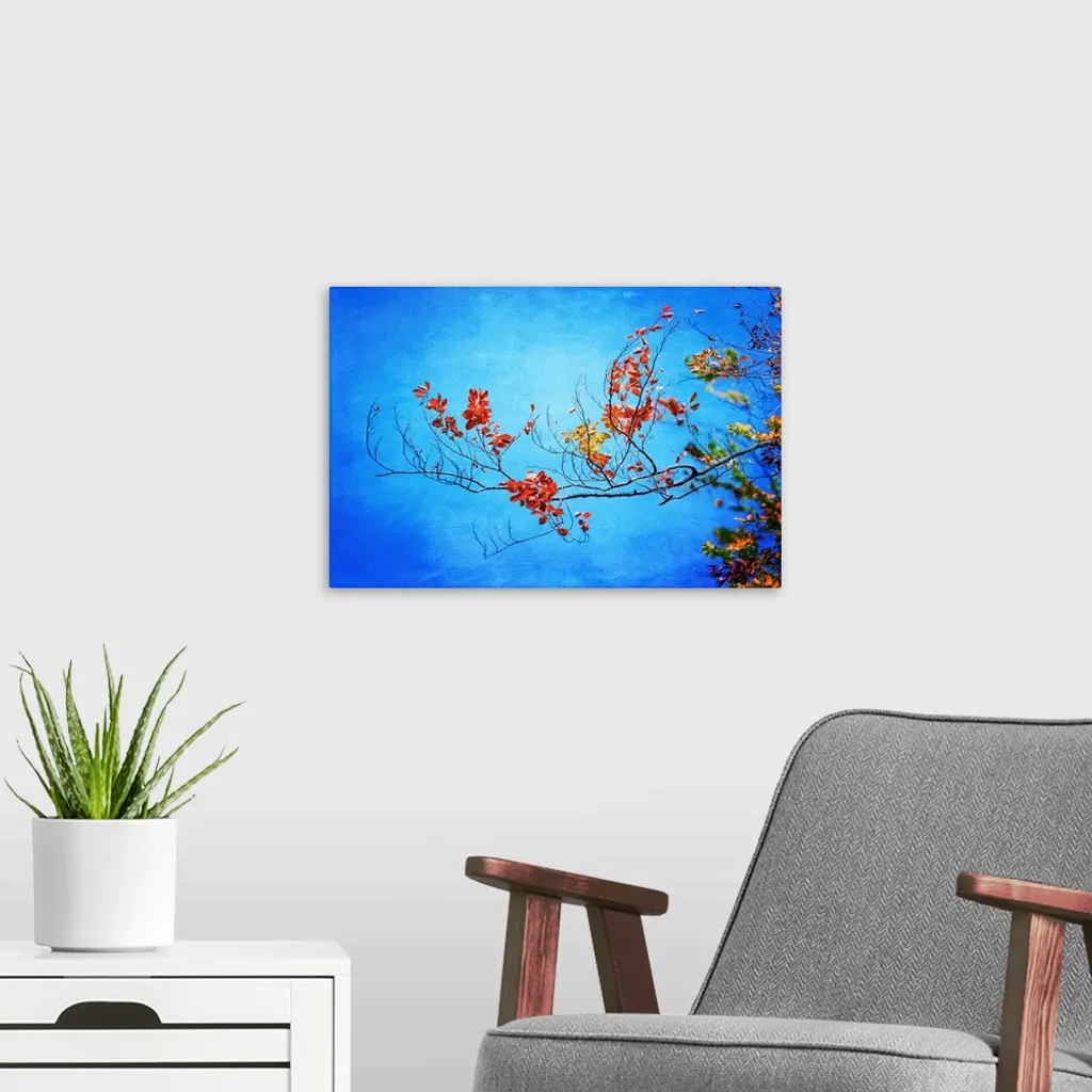 Photograph of a branch with orange, red, and yellow Autumn leaves on a blue background.