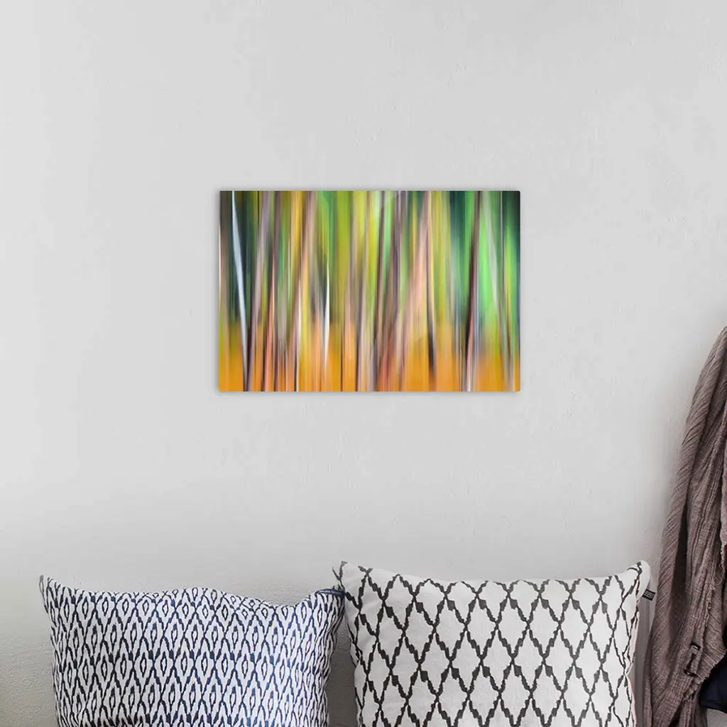 Artistic photograph of a motion blurred and multi-colored forest scene.