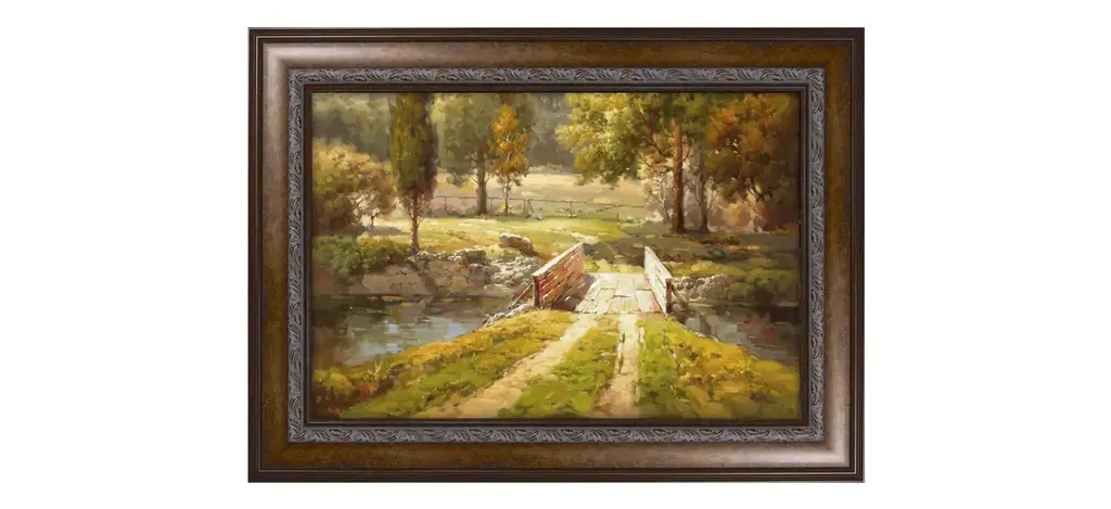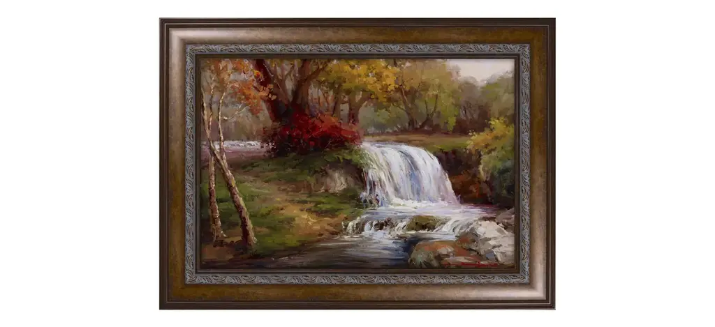 You can almost hear the autumn leaves crackling underfoot in this vibrant wall art of a path leading to a clearing in the woods. The espresso and gold frame picks up on the tones of the tree trunks and shadows, creating a sense of depth.
