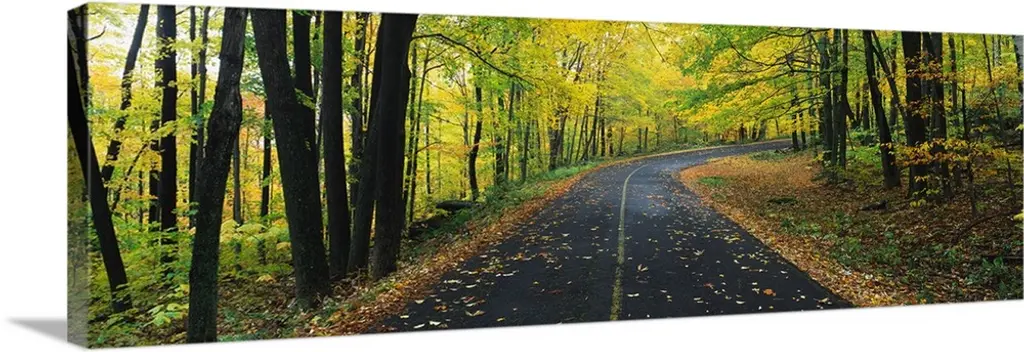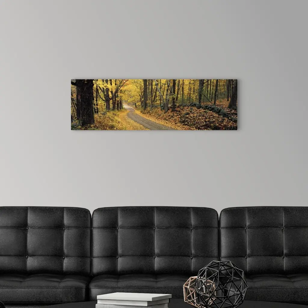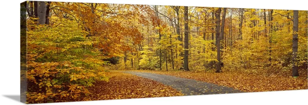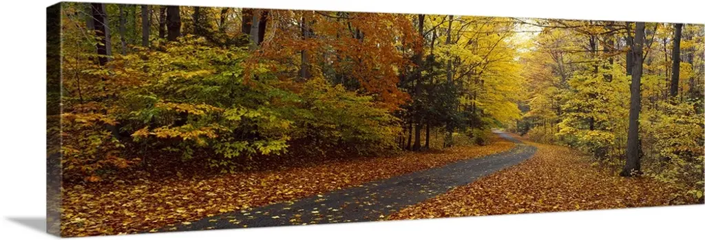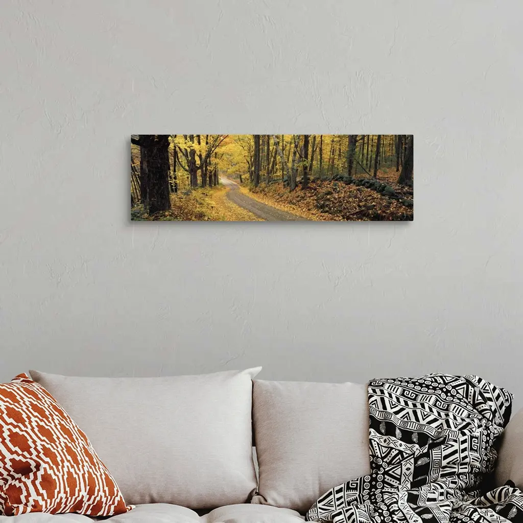 Panoramic photograph of a narrow road winding through a deciduous forest in New Hampshire in Autumn.