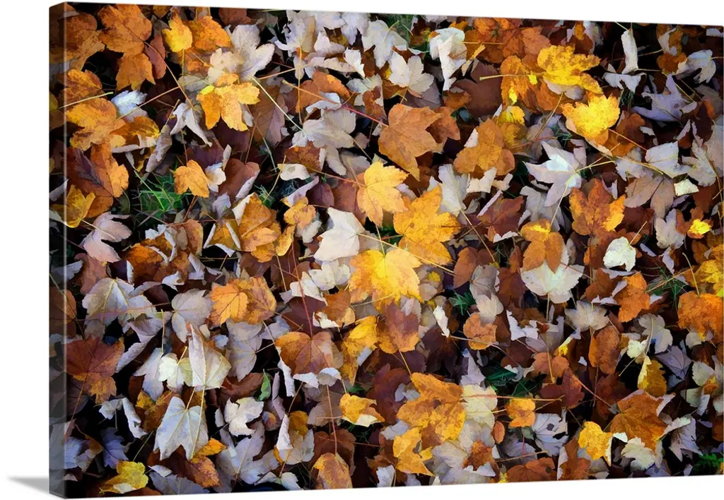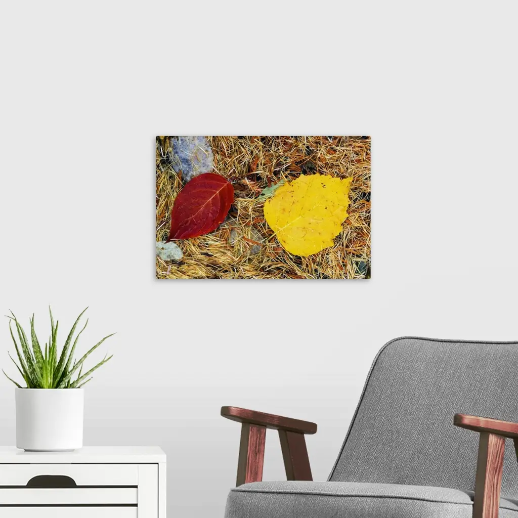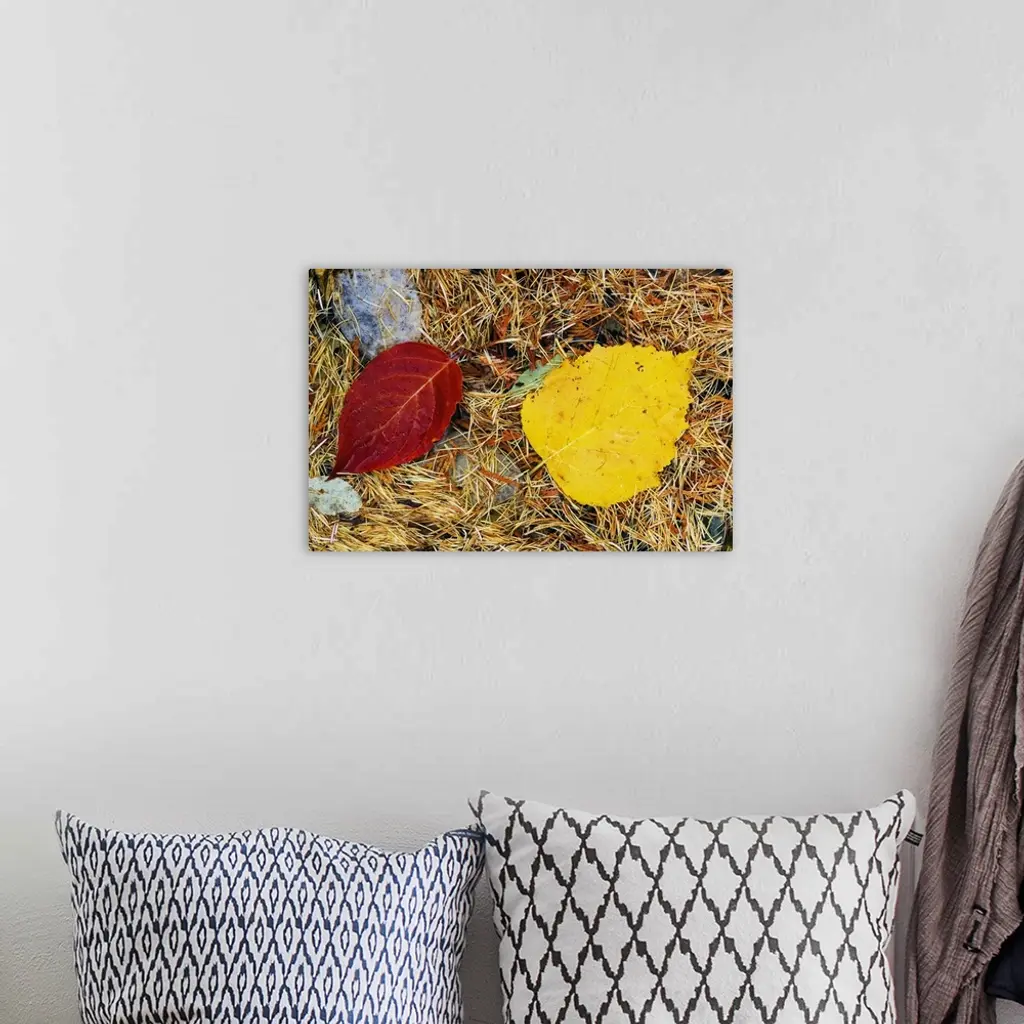 Fallen autumn color leaves in pine needles, detail, Montana wall art for home and office decor. Discover canvas art prints, photos, mural, big canvas art and framed wall art in GreatBigCanvas.com's varied collections.