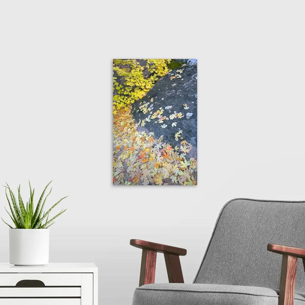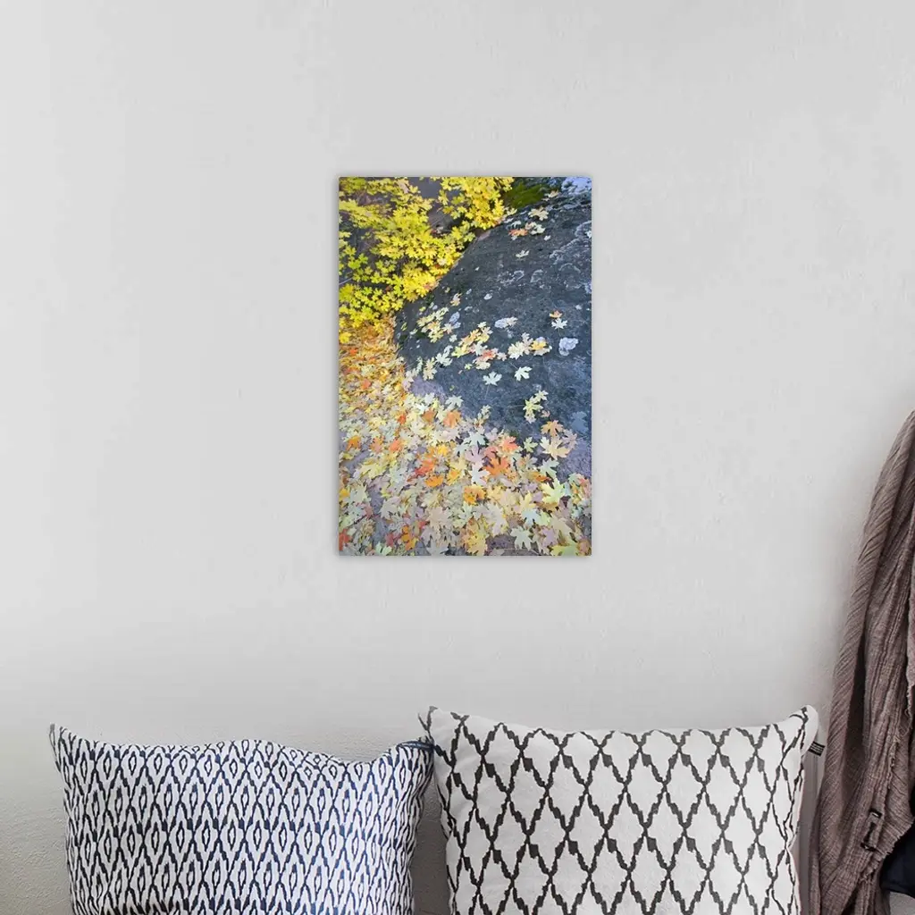 Fallen Autumn Color Maple Tree Leaves On Wet Rock wall art for home and office decor. Discover canvas art prints, photos, mural, big canvas art and framed wall art in GreatBigCanvas.com's varied collections.