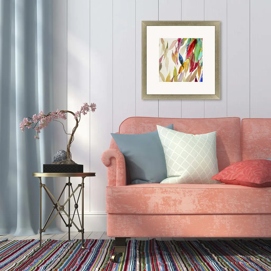 A cascade of colorful falling leaves tumble into oblivion. Double-matted in white and framed in a champagne gold finish moulding.