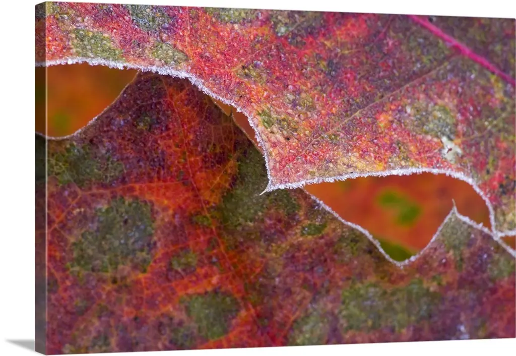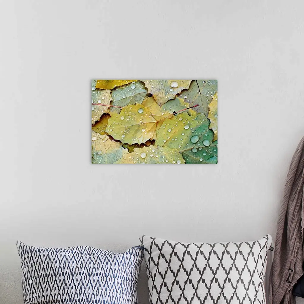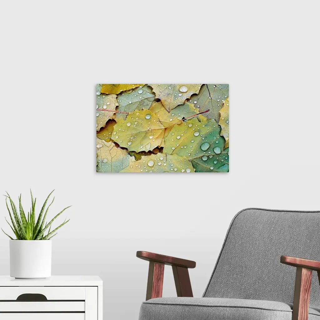 Big photograph focuses on a bed of leaves soaked with rain drops from a recent shower.