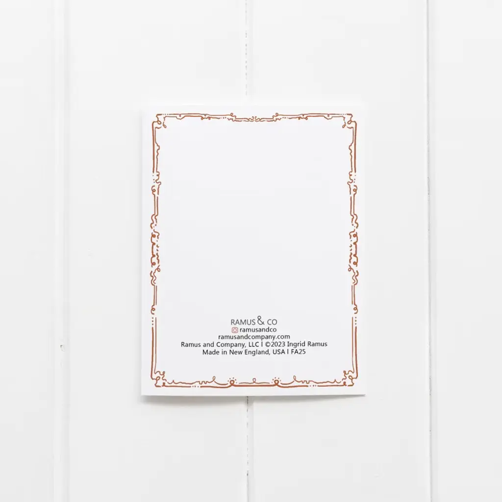 This 3-pack of Fall/Halloween greeting cards is elegantly illustrated by artist Ingrid Ramus, founder and owner of the Ramus & Co brand. The cards are blank inside. All greeting cards are made in the USA on heavyweight uncoated and locally-manufactured card stock. Each card is individually wrapped in TUV Austria certified-compostable PLA sleeves that meet both ASTM D6400 & EN 13432 standards. Each card is accompanied by a hand-embossed envelope made with heavyweight 95lb paper and a peel-and-stick flap - no licking envelopes here! All Ramus & Co. greeting cards are printed on FSC¬¨¬ and SFI¬¨¬ certified paper sourced from a regional mill that harnesses 66% of its energy from on-site sustainable sources, such as emission-free hydroelectricity and biomass co-generation from wood waste. Additionally, our greeting cards are thoughtfully packaged in bags made from certified compostable PLA material. Husband-and-wife team Calvin and Ingrid Ramus founded Ramus & Company in 2019, in New England, USA. Ingrid, the creative designer behind the brand, originates from Mexico, where she cultivated her skills in fashion and textile design. Drawing from her unique and inquisitive perspective on preppy style, Ingrid prolifically designs whimsical yet classic stationery and lifestyle items..