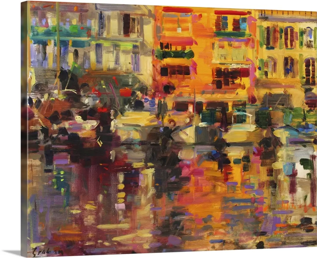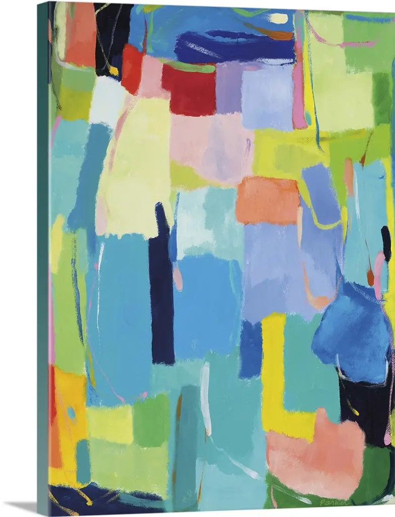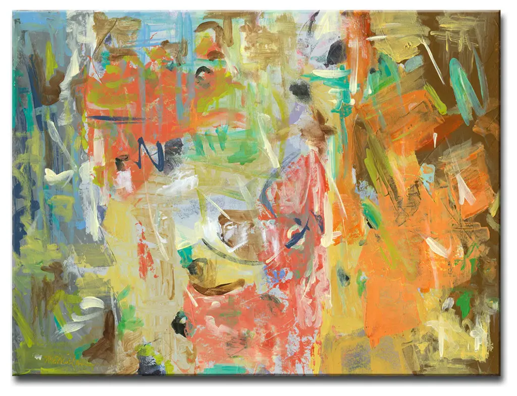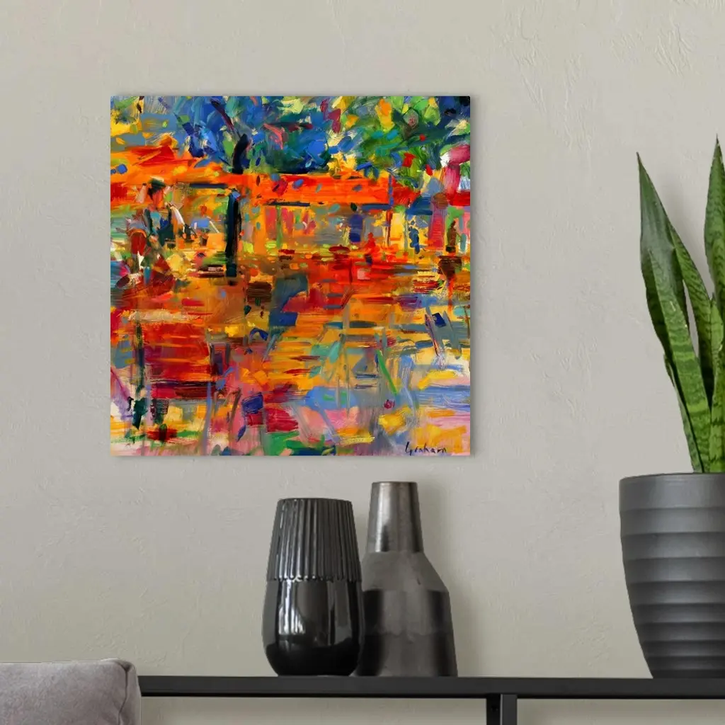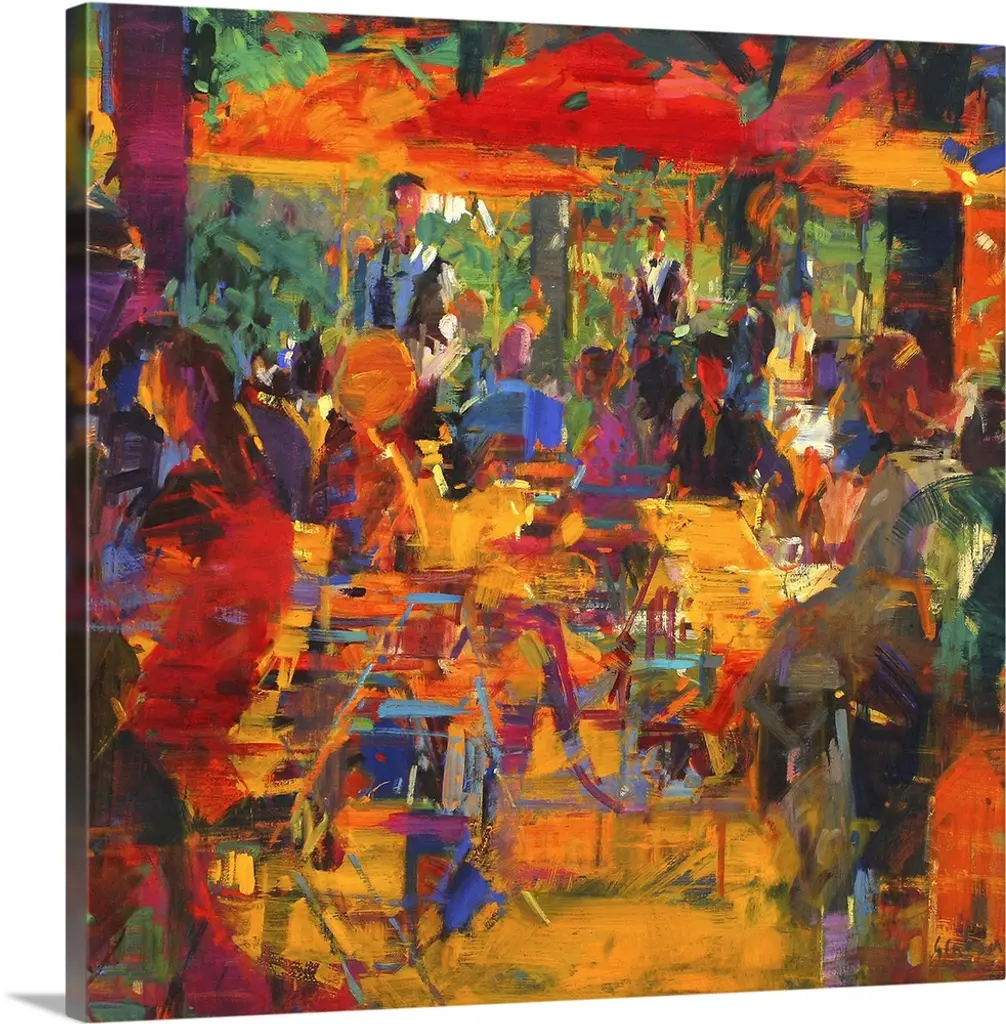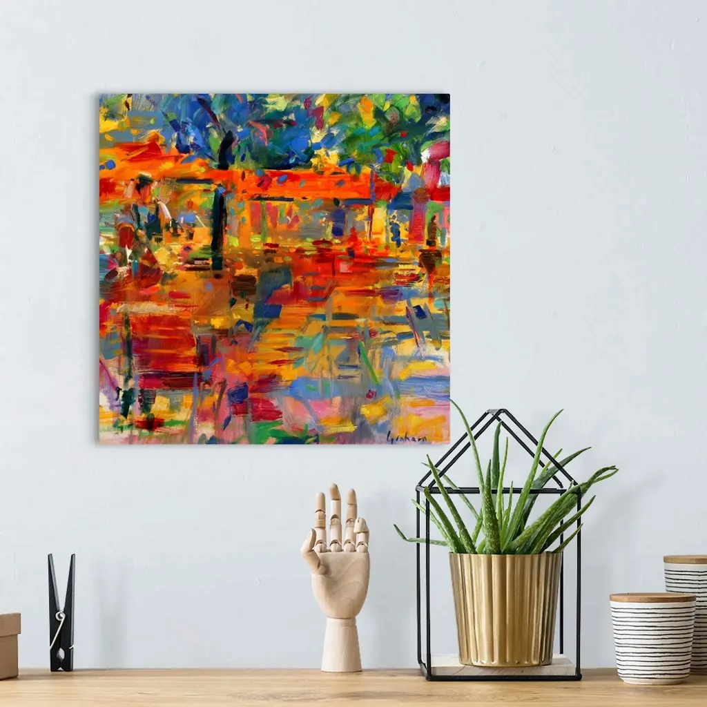 Square wall art for the living room or office of an abstract outdoor cafo tables under trees.