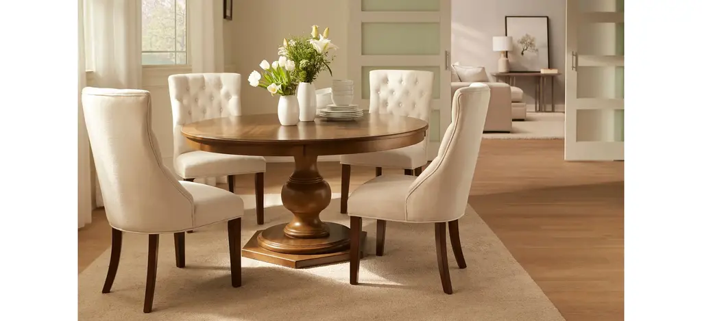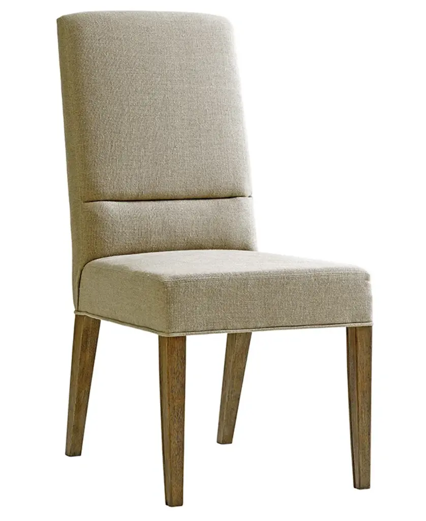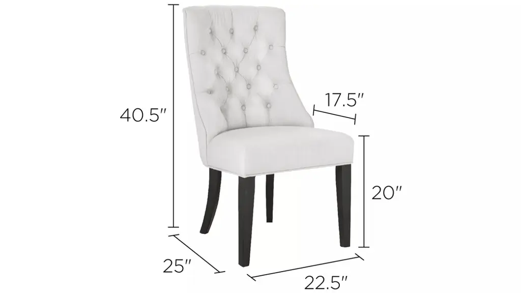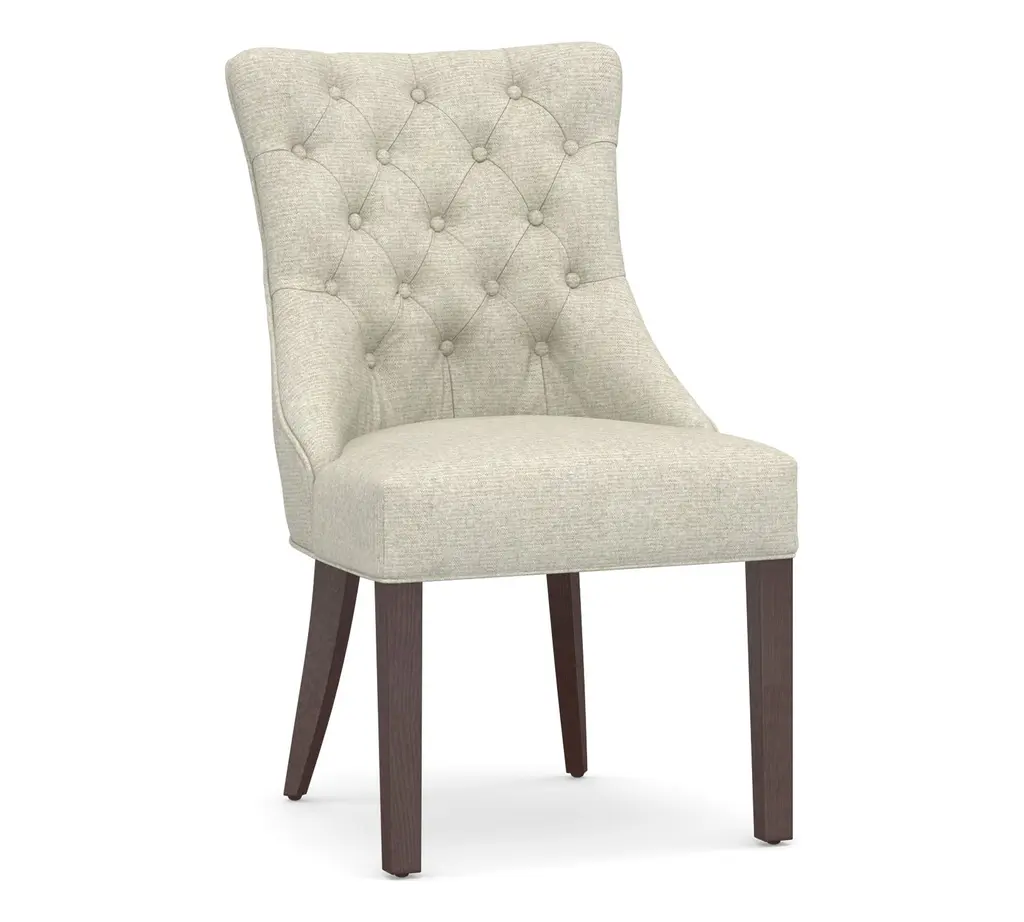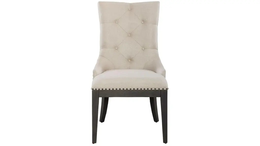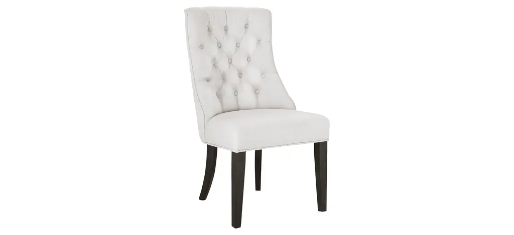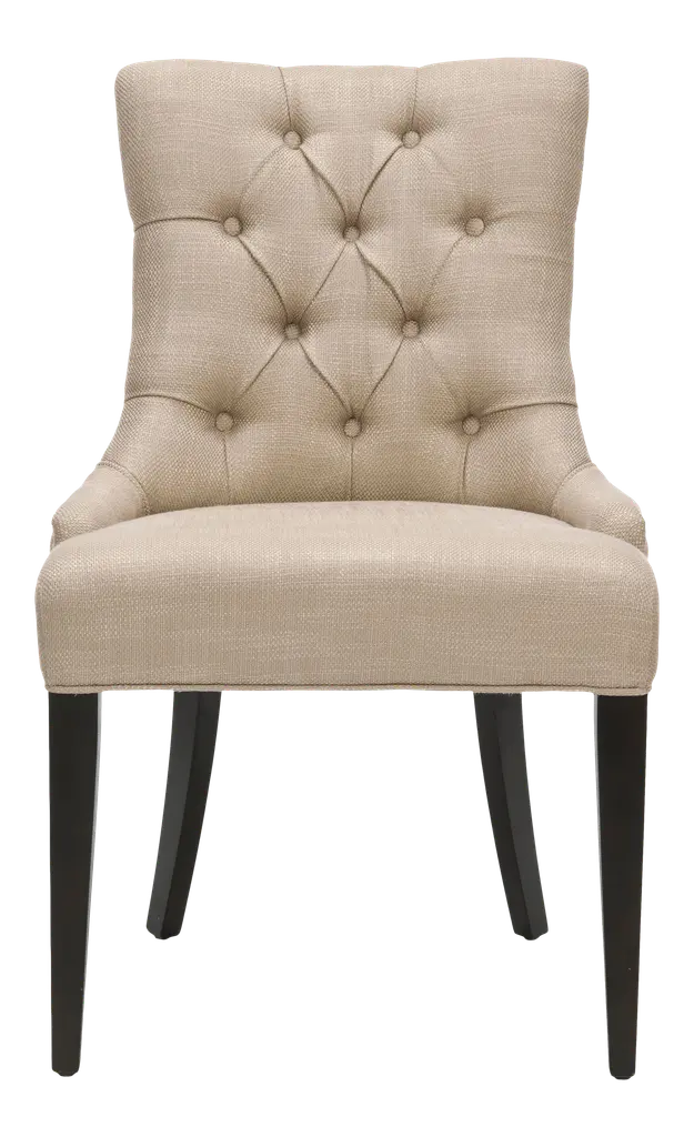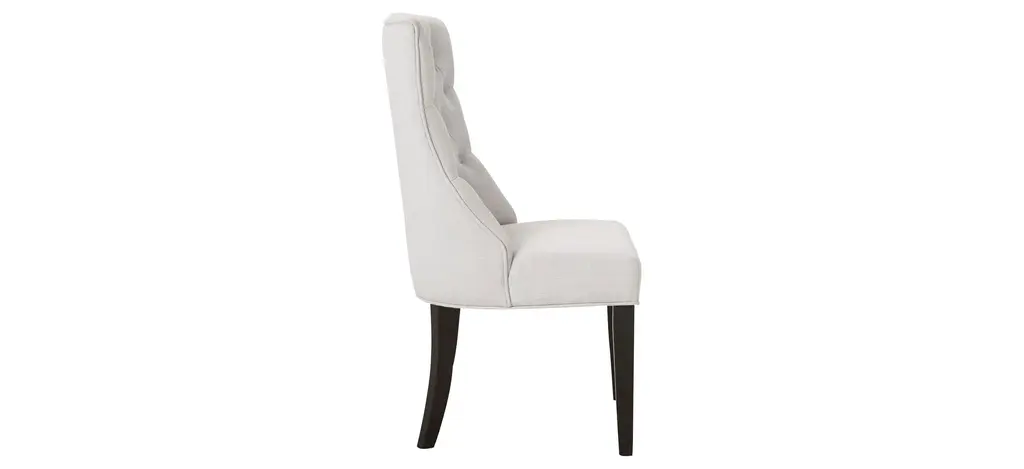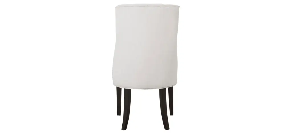 With upholstered button tufting and contrasting dark wood legs, the Fallon dining chair is a daring approach to posh in the dining room. Sophistication is served. Comfortable, stylish seating invites dinner guests to linger long past the meal, they will bring their best manners to a graceful dining room. Looks like the dining scene is just what you imagined: Simply elegant.