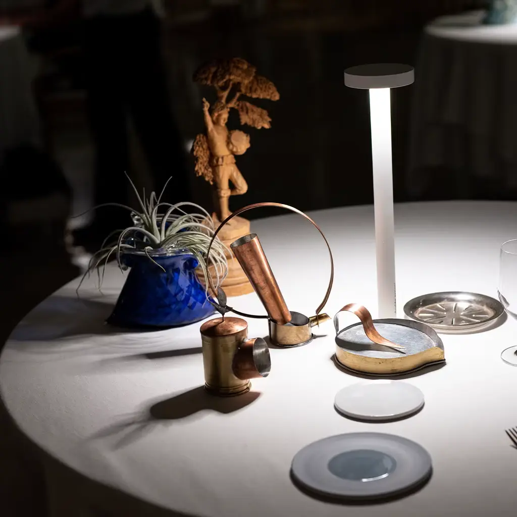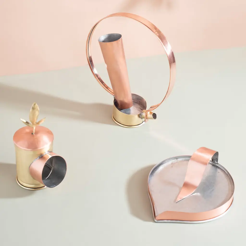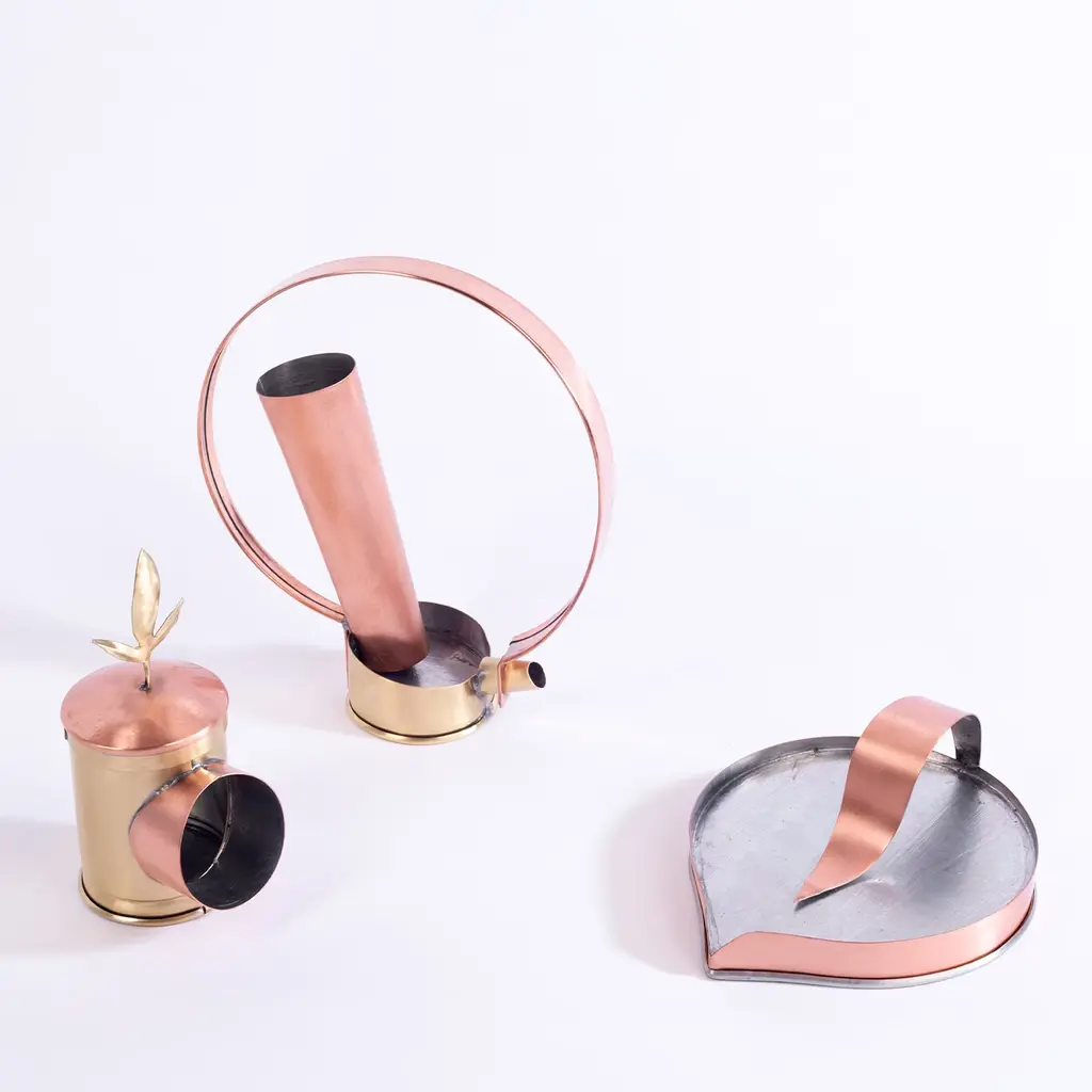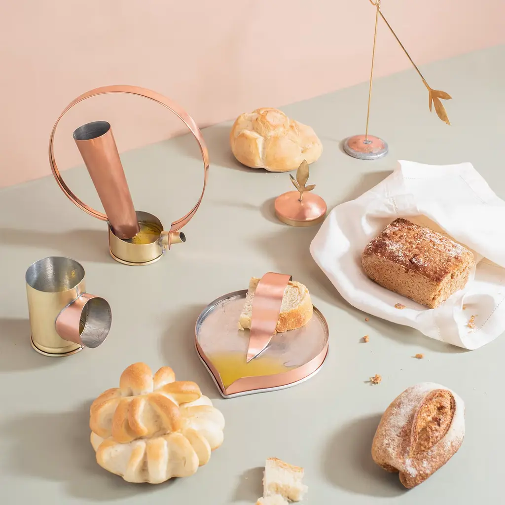 Famiglia Oliva is a Collection designed for dosing and tasting “olive oil”. It is composed of Gea, the bread & oil plate, Elio, the spoon to dose and serve the oil, and Pigi, the tin dedicated to the olfactory experience. The objects are hand-made in tin-plated brass and copper, characterized by archetypal shapes. The naming of the three objects contains the three fundamental elements for cultivation. Design partner: Astrid Luglio; Food partner: Mariella Caputo; Handmade partner: Rua Catalana.