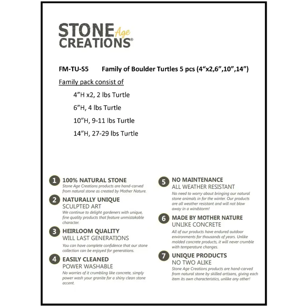 This adorable Family of Boulder Turtles would be a great addition around your garden or in your home. They also make perfect gifts! They are hand carved from Natural Granite Boulders making each turtle unique in size and color. This 5 piece set includes two 4" 1-2lbs one 6" 2-3lb one 10" 9-11lb & one 14" 27-29lb Boulder Turtle. Height and weight are approximate.
