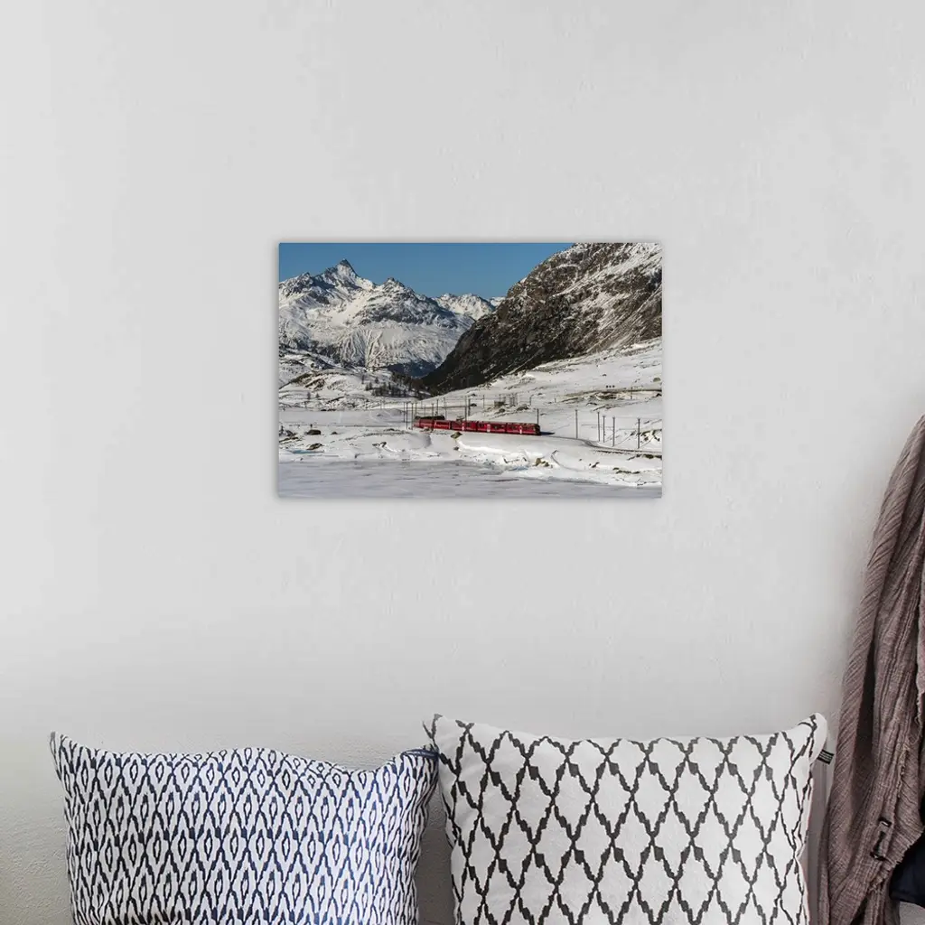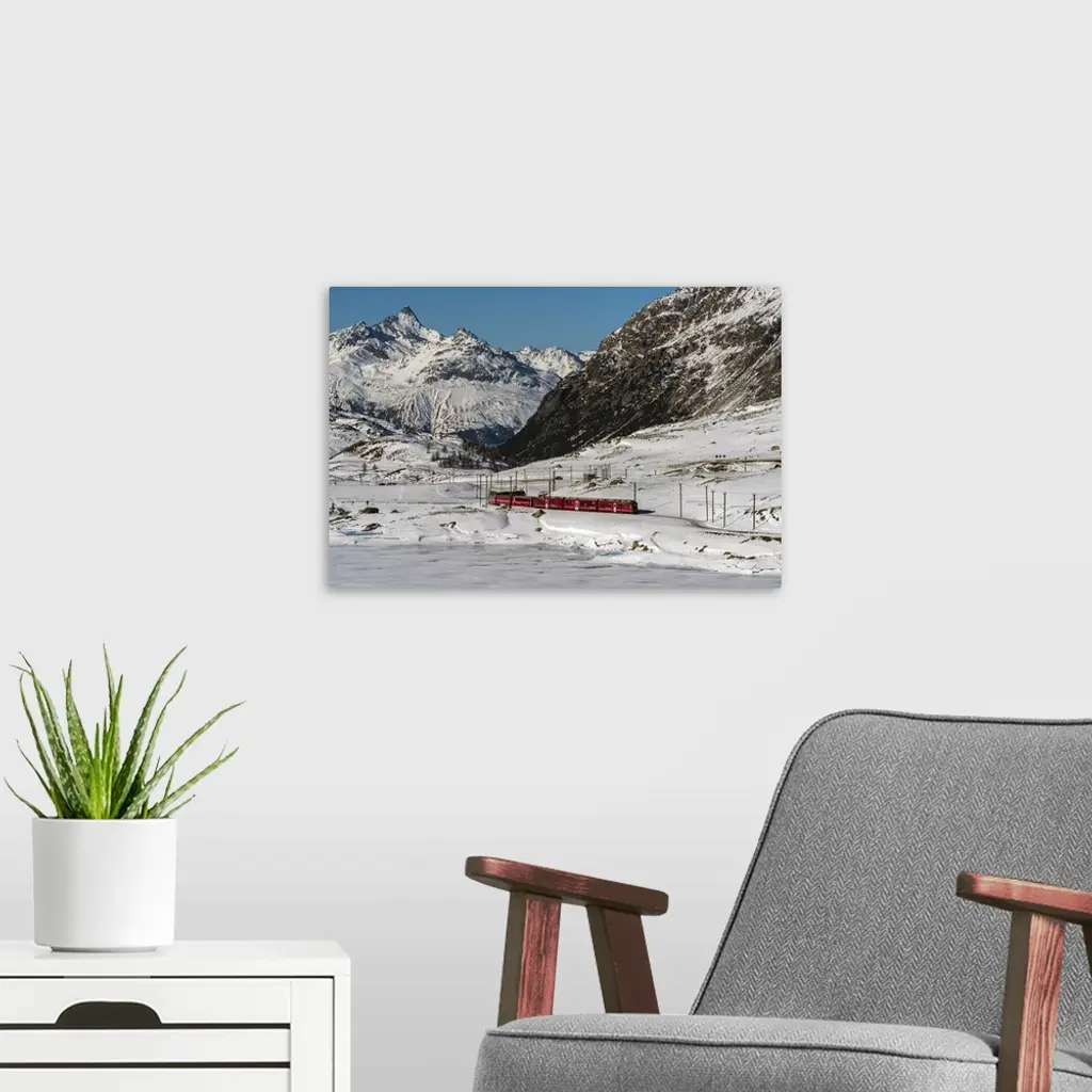 The famous Bernina Express red train passing Lago Bianco in a scenic winter mountain landscape, Graubunden, Switzerland