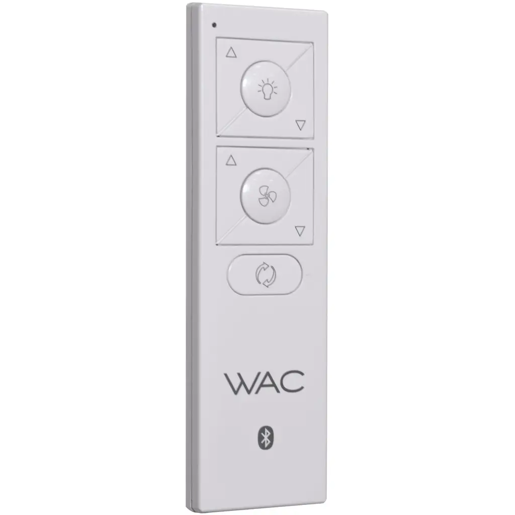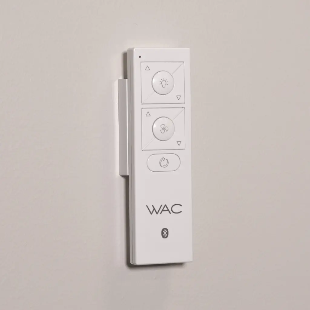 Battery operated bluetooth wireless remote for fan control. Wireless remote is optional - each WAC Lighting Ceiling Fan can be controlled through the paid WAC Lighting App available in the Google Play or App Store. Battery operated (CR 2032 battery included), lasts up to 5-years with normal use. Luminaire on/off control and 0-100% brightness control with fan on/off button and 6 speed fan control. Includes Winter/Summer mode switch to reverse fan for warm or cool air flow. Includes a magnetic cradle with easy installation for wall mounting.