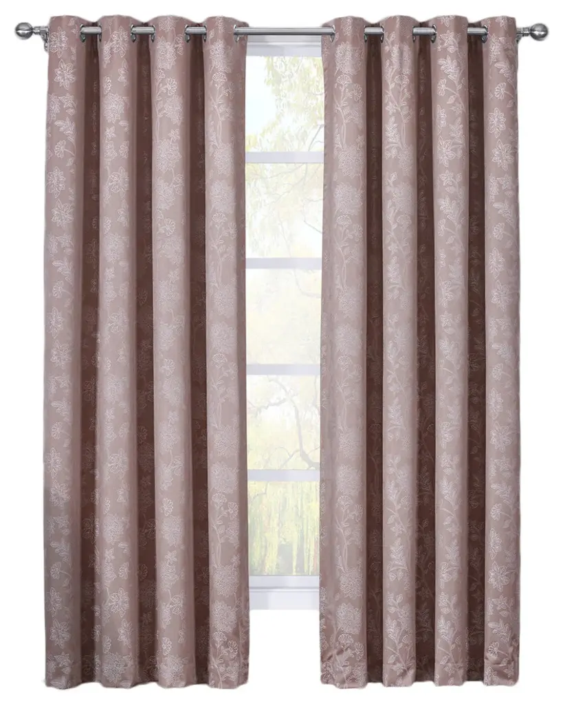 Fannie 100% Blackout curtains were woven in modern Jacquard theme with thermal insulating triple pass back coating to create a total blackout drapes. An Upscale modern design was converted into jacquard woven fabric to bring this theme to life on fabric. To create a total blackout, effect the back side of the fabric went through 3 stages of coating each at different time intervals. This drape can help in reduction of energy costs. It saves on heating and cooling costs by blocking sunlight from entering in summer time and it keeps heat from escaping during winter. •100% Polyester Grommet Panels•100% Blackout from sunlight and UV rays•Triple Pass Thermal Insulated Back side coating•Energy Savings, Privacy and Noise Reduction•Sold in Pairs (Each package contains two panels)•Each Panel has 8 Grommets (1.6" inner grommet diameter)•Heavy weight Fabric •Royal Tradition Collection•Machine WashAvailable Sizes Include:•108"�W x 63"�L Pair ( 54"W X 63"L Each Panel) •108"�W x 84"�L Pair ( 54"W X 84"L Each Panel) •108"�W x 96"�L Pair ( 54"W X 96"L Each Panel) •108"�W x 108"�L Pair ( 54"W X 108"L Each Panel)