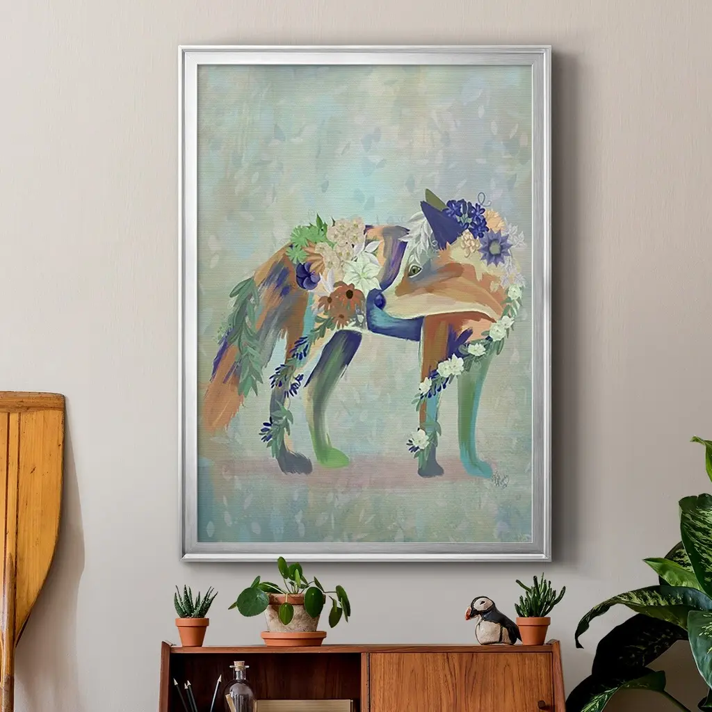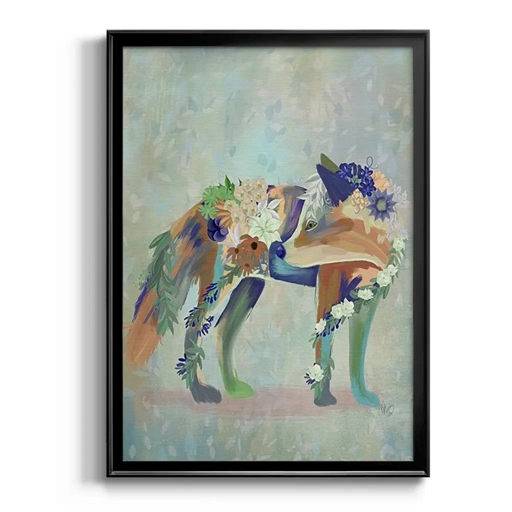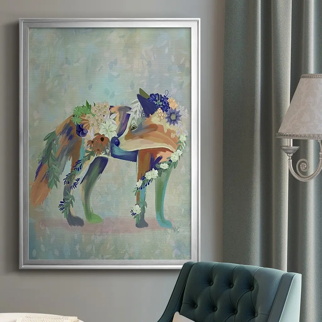 Fantastic Florals Fox, Standing Premium Framed Print - Ready to Hang A Premium Framed Print created to last. Framed in distressed wood and available in an array of sizes and colors Featuring a beveled a solid wood stretcher bar, each piece comes ready to hand 4 SIZES AVAILABLE 30.5''X42.5'' - Overall Size 26.5'X36.5'' - Overall Size 22.5''x30.5'' - Overall Size 18.5''x24.5'' - Overall Size Each piece is made to order. Each piece comes with hanging hardware. Made in the USA Ready to Hang
