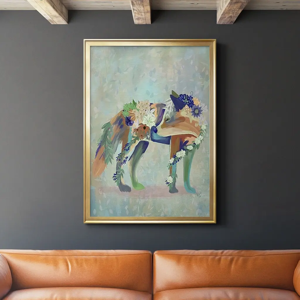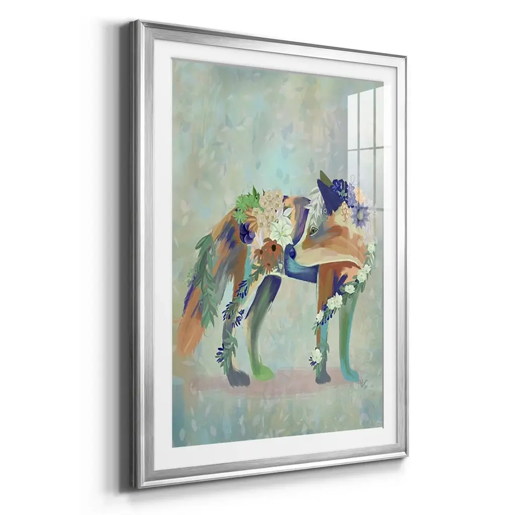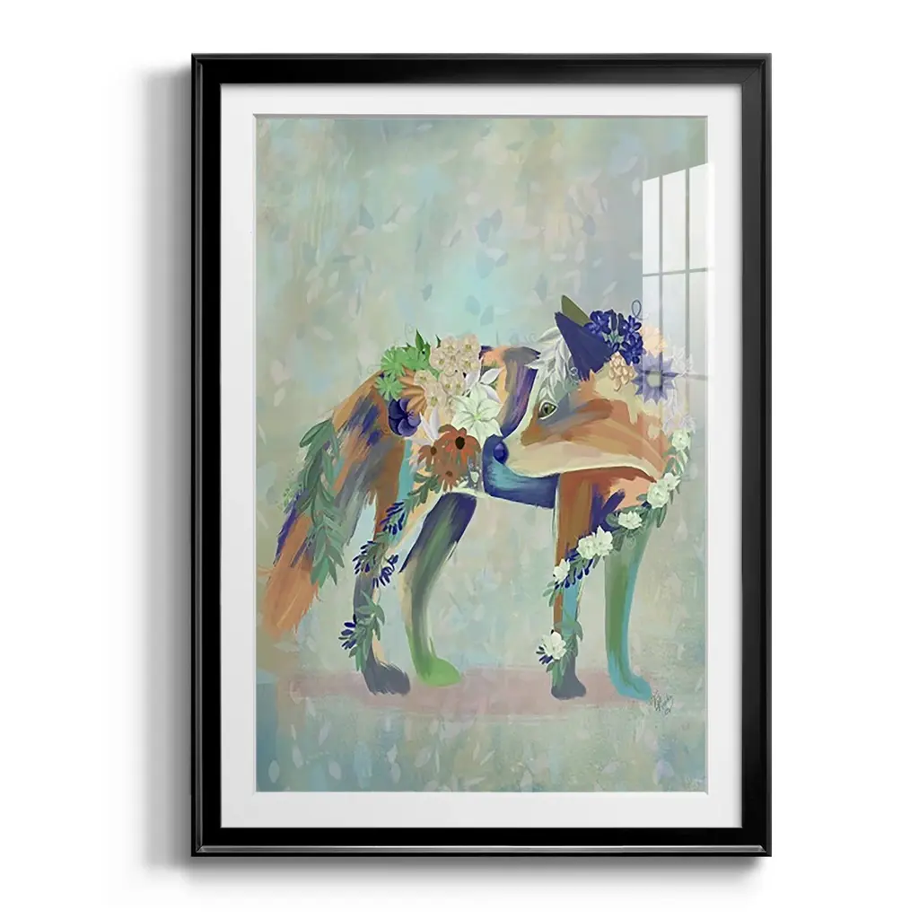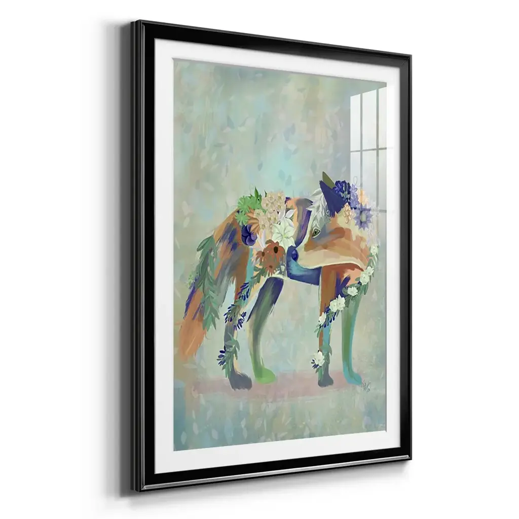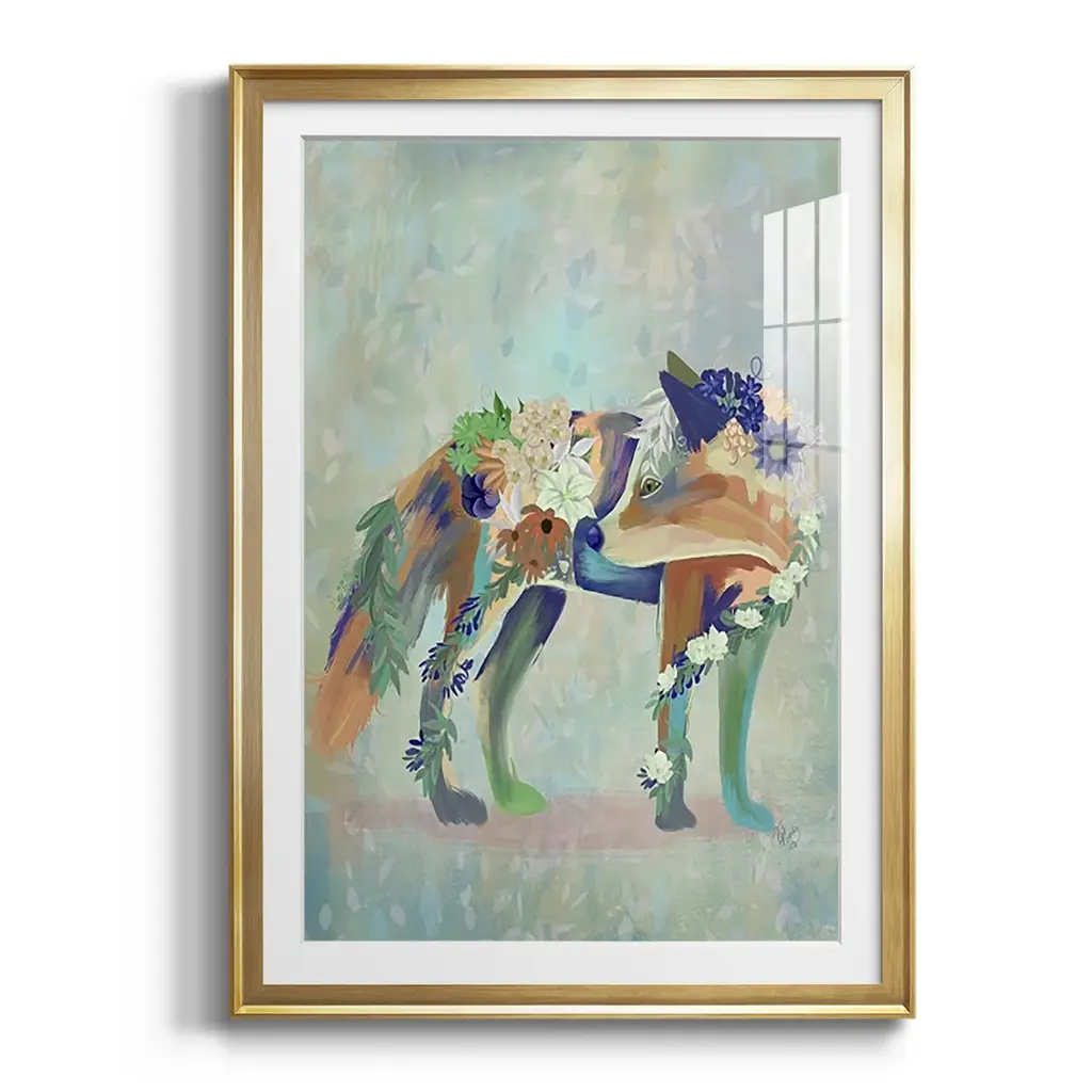 Fantastic Florals Fox, Standing Premium Framed Print - Ready to Hang A Premium Framed Print created to last. Framed in distressed wood and available in an array of sizes and colors Featuring a beveled a solid wood stretcher bar, each piece comes ready to hand 4 SIZES AVAILABLE 30.5''X42.5'' - Overall Size 26.5'X36.5'' - Overall Size 22.5''x30.5'' - Overall Size 18.5''x24.5'' - Overall Size Each piece is made to order. Each piece comes with hanging hardware. Made in the USA Ready to Hang Giclee Paper Print Acrylic Glass Beveled Matt Board
