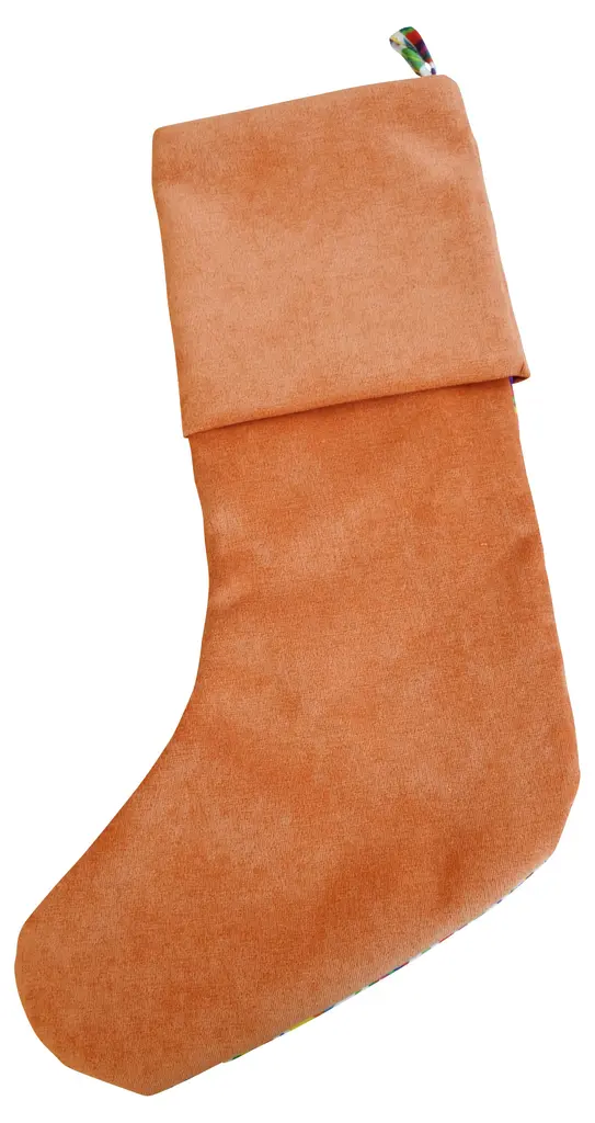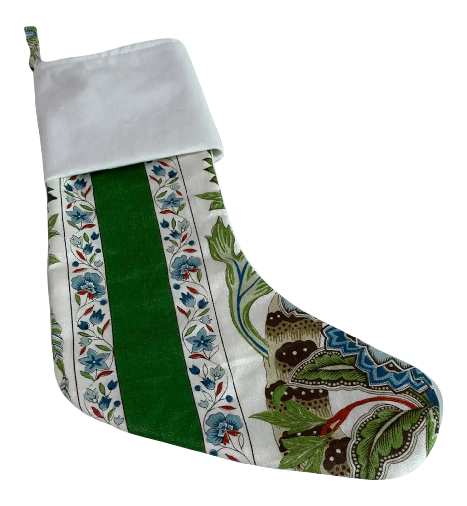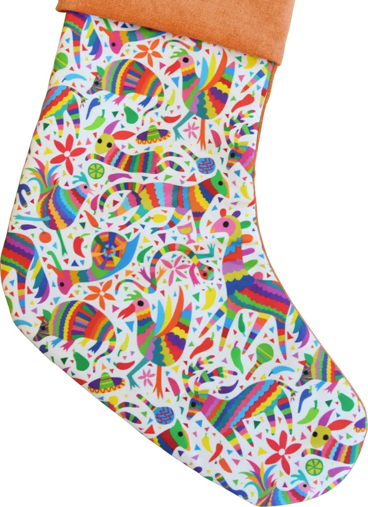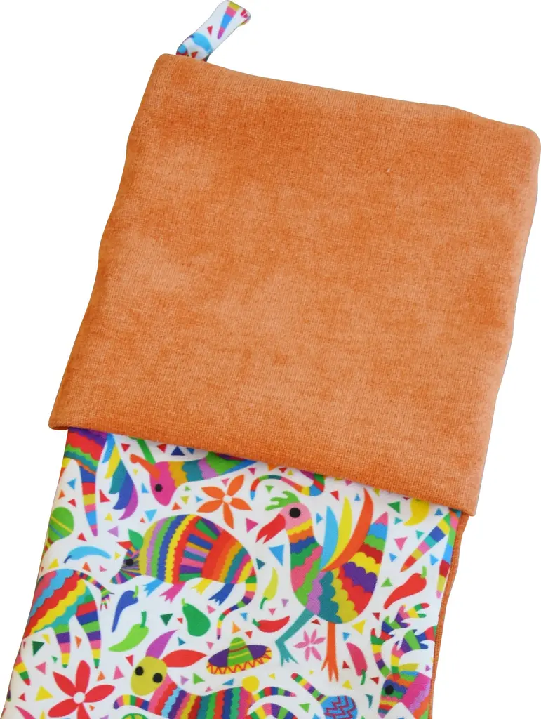 Custom-tailored Christmas stocking made from colorful Otomi-style cotton fabric depicting an array of colorful animals. Reverse and cuff is a cotton velvet fabric. Stocking is lined and has an attached matching hanging loop. No maker's mark. Please note: the placement of the design may vary according to the fabric cut.