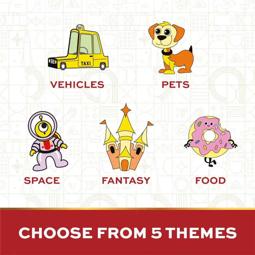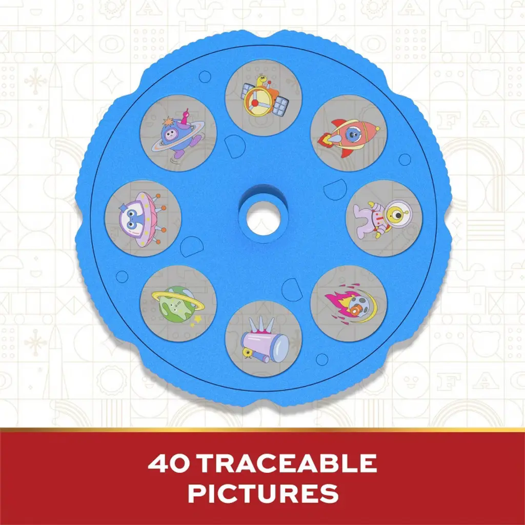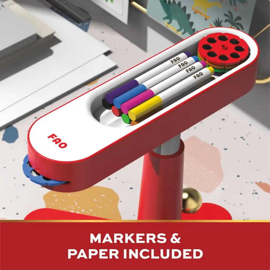 The FAO Schwarz® Art Tracing Projector 34-Piece Set makes it easy for kids to create their own colorful masterpieces. With adjustable height and a focus dial, the light-up projector clearly displays traceable images from five themed gears including pets, vehicles, food, space, and fantasy. The set includes 6 markers, 20 sheets of paper, and 5 tracing gears that store easily on top of the projector for quick cleanup. Kids can spin the gear to switch images and bring their drawings to life. Perfect for building confidence, fine motor skills, and creative self-expression, this portable projector set is ready for art time anywhere.