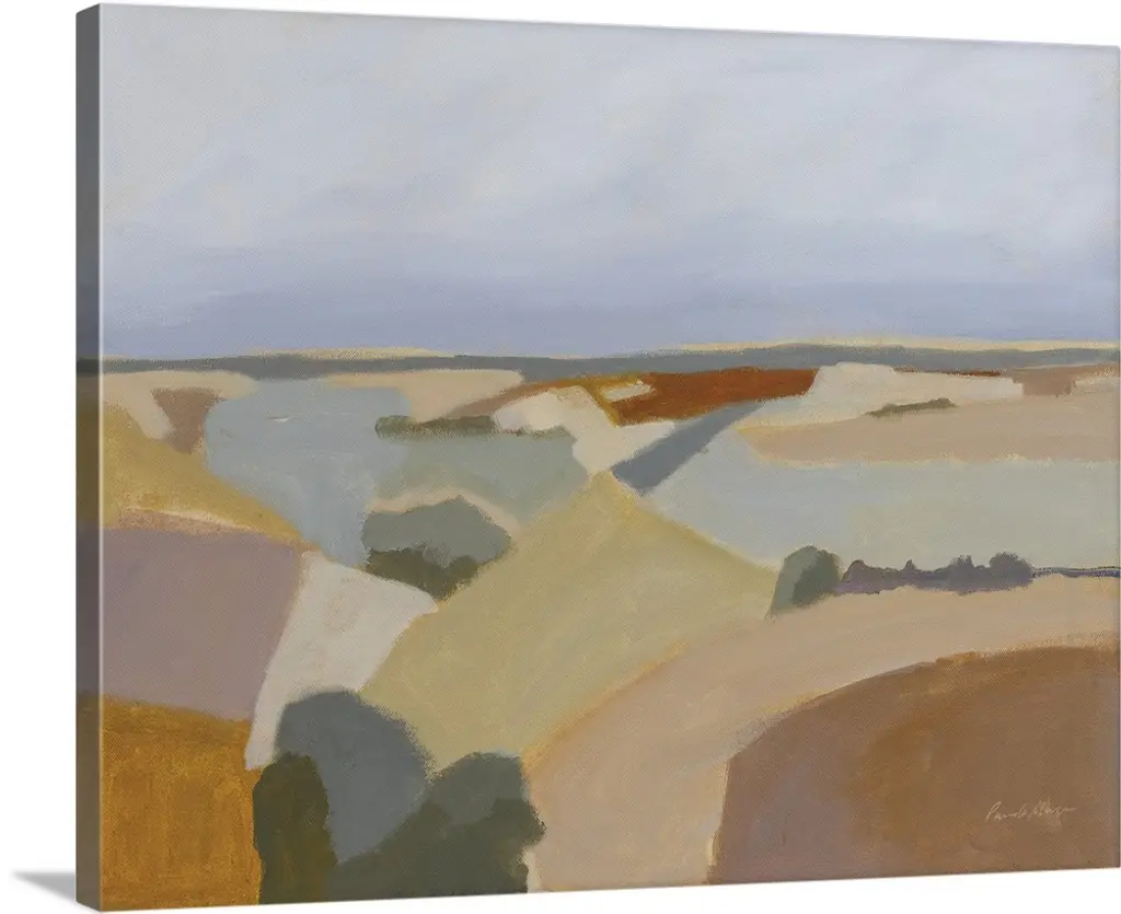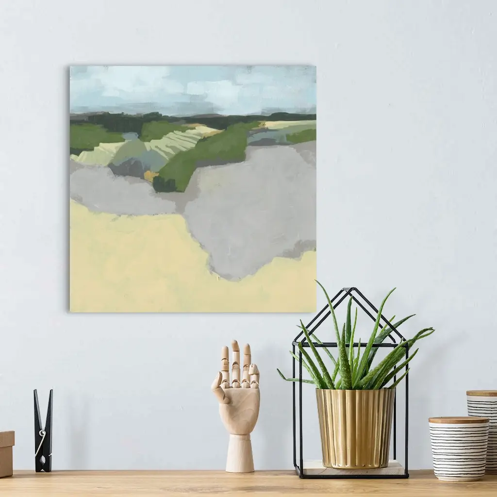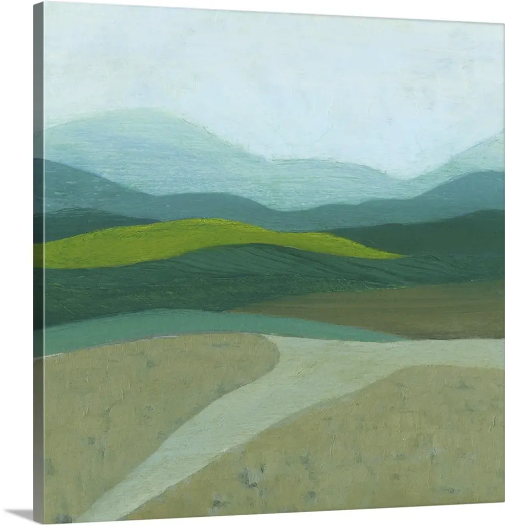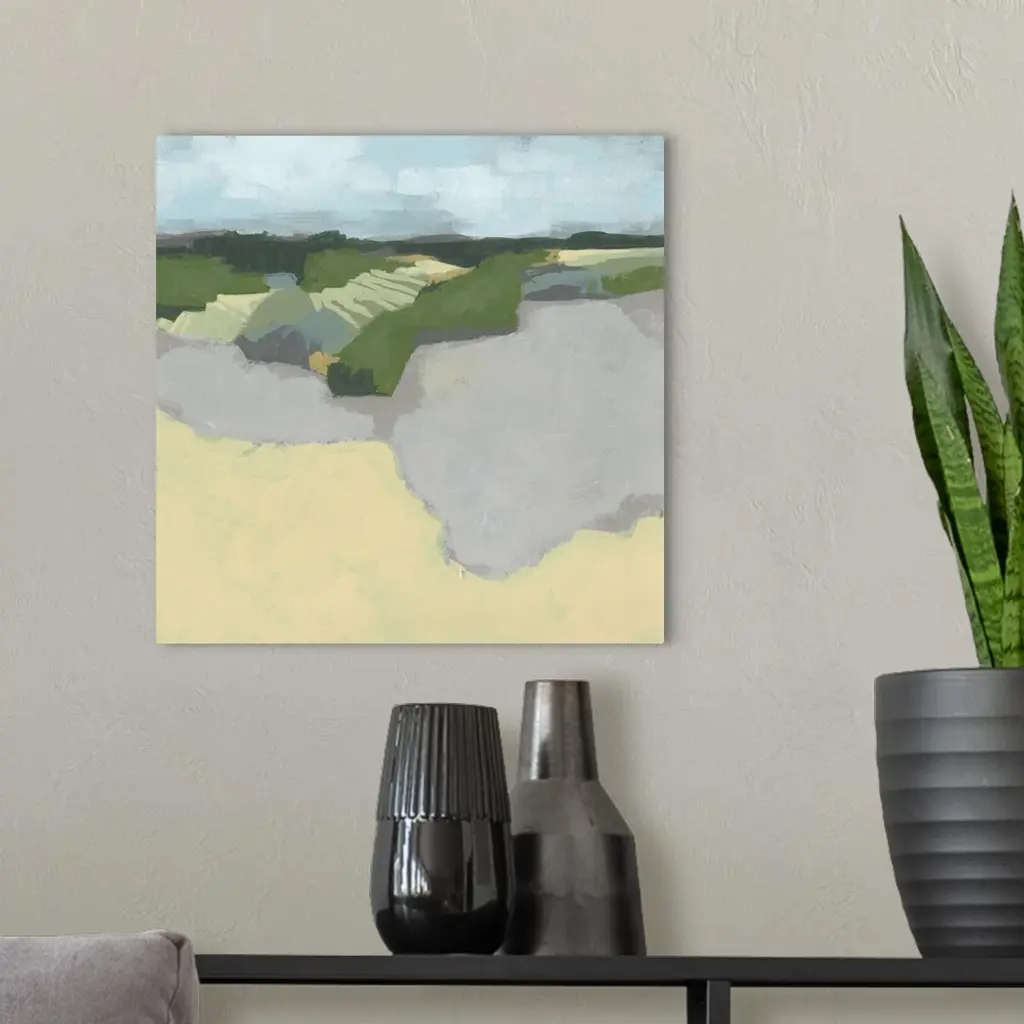 Contemporary abstract landscape in green, brown, and gray with a light blue sky overhead.