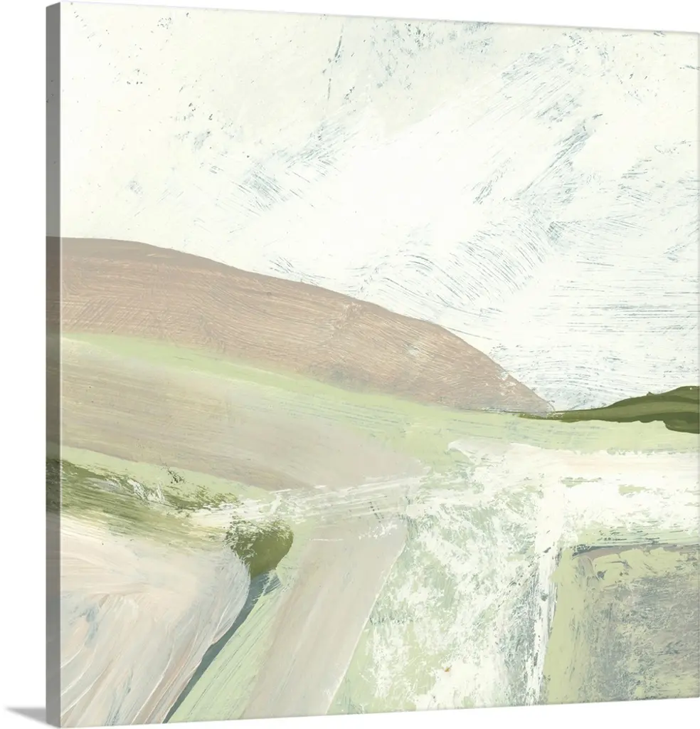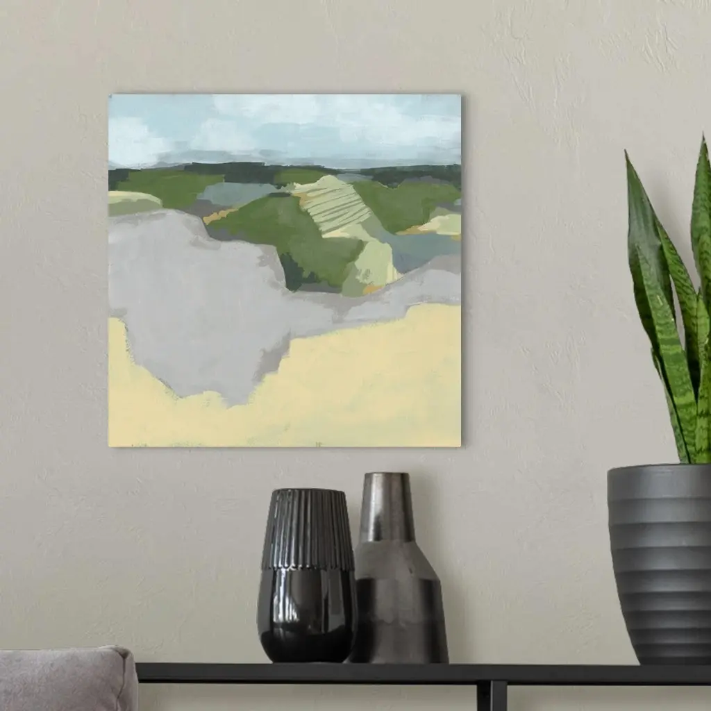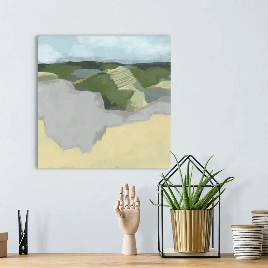 Contemporary abstract landscape in green, brown, and gray with a light blue sky overhead.