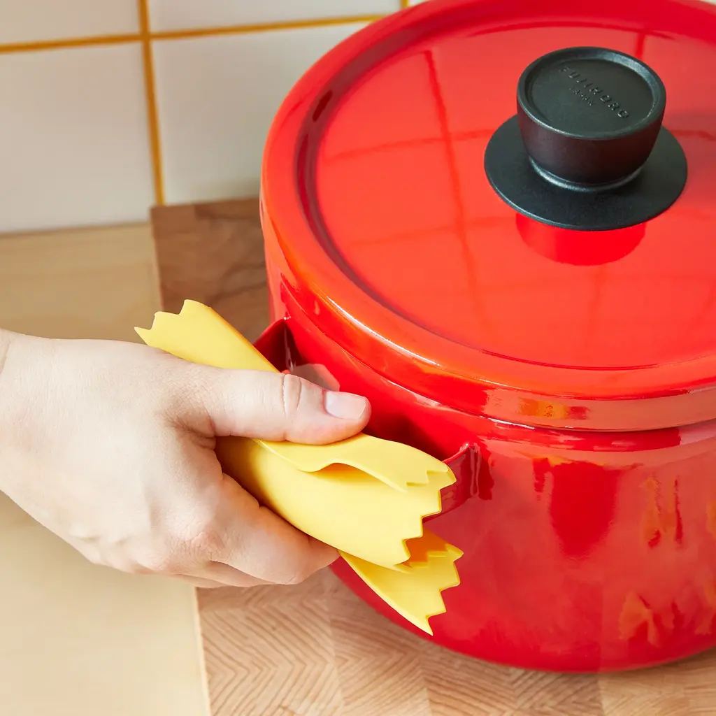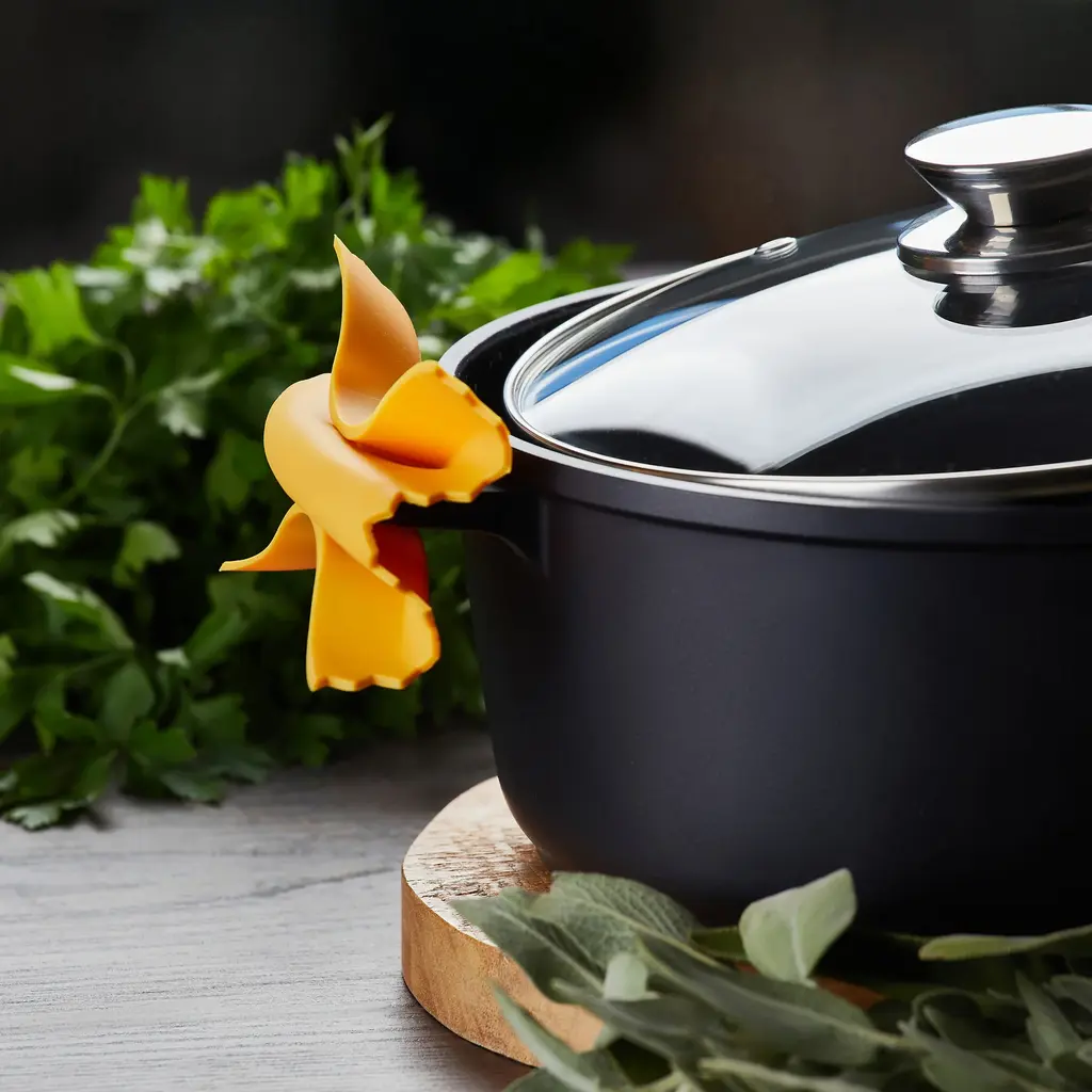 Amuse your dinner party guests with this set of pot grips fashioned in the shape of outsized farfalloni (bowtie) pasta. Made from heavy-duty, heat-resistant silicone, the grips also function as whimsical objects on your kitchen counter. Each Farfalloni Pot Grip in this set of two measures 1.5h x 4.3w x 3.4"d. Dishwasher-safe.