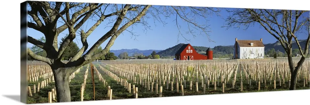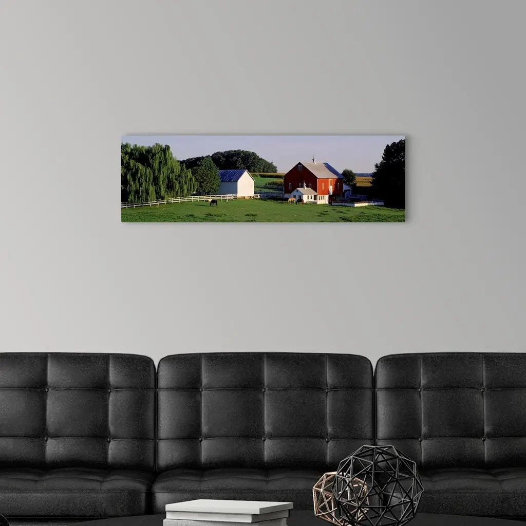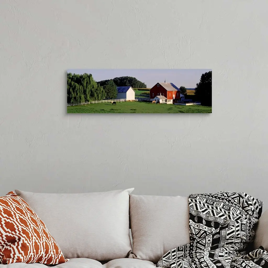 Farm land is photographed in panoramic view with large trees on either side of the barn and in the background.