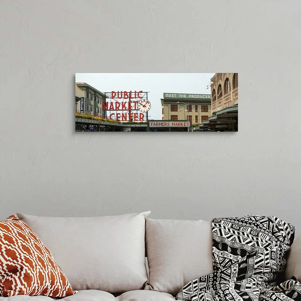 Panoramic photograph of the downtown Farmers Market at Pike Place Market in Seattle, WA.