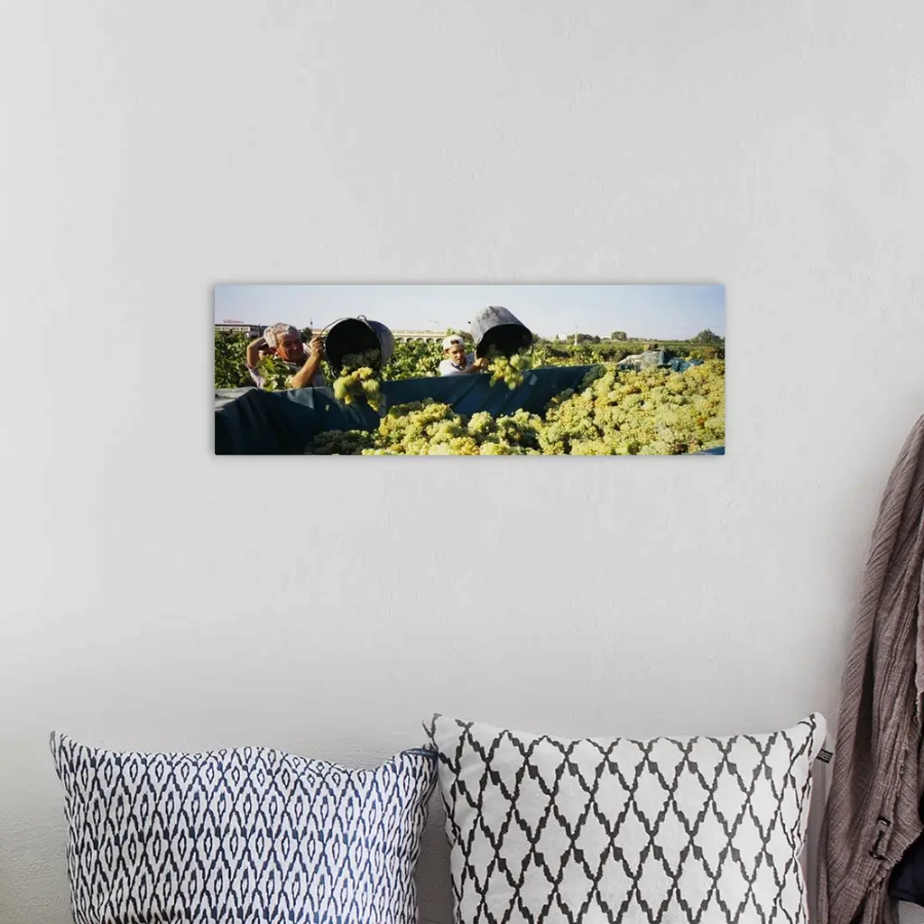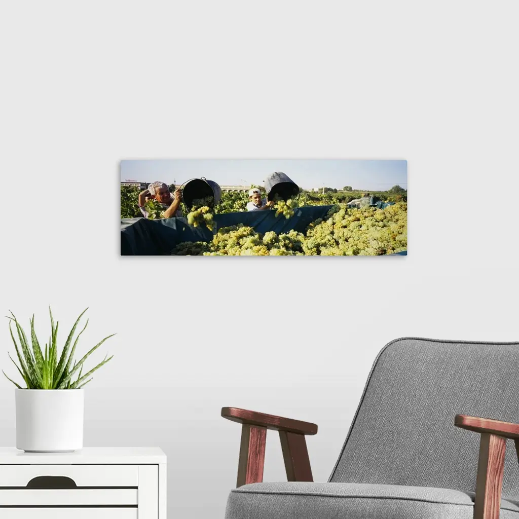 Farmers pouring grapes from buckets in a truck in a vineyard, Spain wall art for home and office decor. Discover canvas art prints, photos, mural, big canvas art and framed wall art in GreatBigCanvas.com's varied collections.