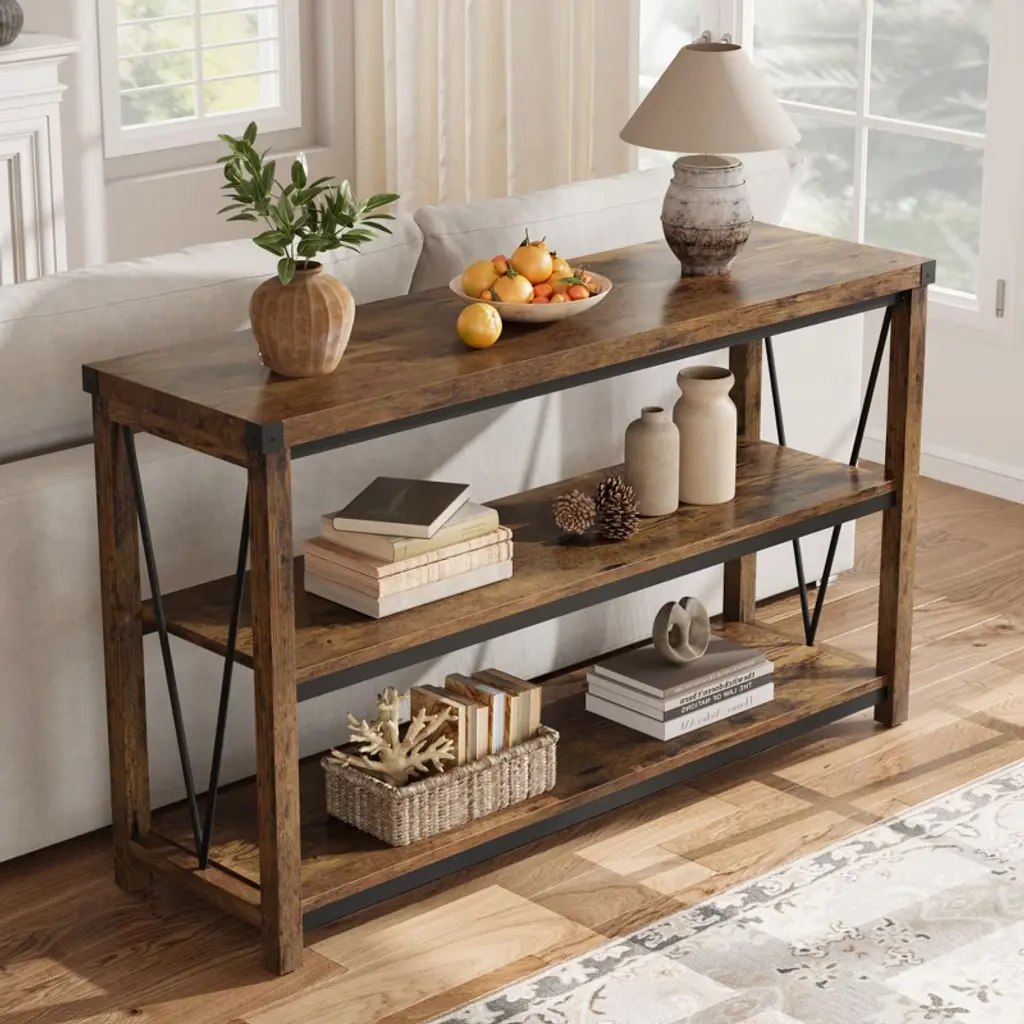 Spacious Storage Space: This sofa table with storage measures 47.2" x 13.4" x 30" with a wide desktop, and 3-tier entryway table design providing ample storage space where you can display your favorite photos, books, and decorations. Versatile Console: With a stylish and simple design, this long console table complements various home decor styles. Wood console table works perfectly as an entryway table, sofa table, hallway table, behind couch table, or even a TV stand. Strong and Durable Construction: The foyer table top is made from high-quality MDF board with a V-shaped design on the sides for added stability, and the grey console table for the entryway is durable and scratch-resistant. Farmhouse Style: The elegant design and meticulous craftsmanship of these foyer tables for the entryway embody the simplicity and warmth of farmhouse style. Whether placed in the entryway, behind the couch, or hallway, the metal entertainment center console adds a natural and inviting ambiance to your home. Easy Installation: The package includes detailed instructions for easy assembly of the narrow console table. No professional skills or experience are required - simply follow the step-by-step instructions to save time and effort.