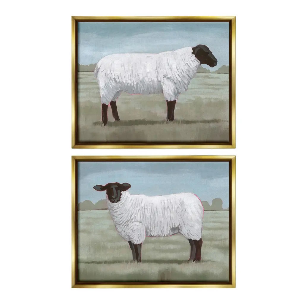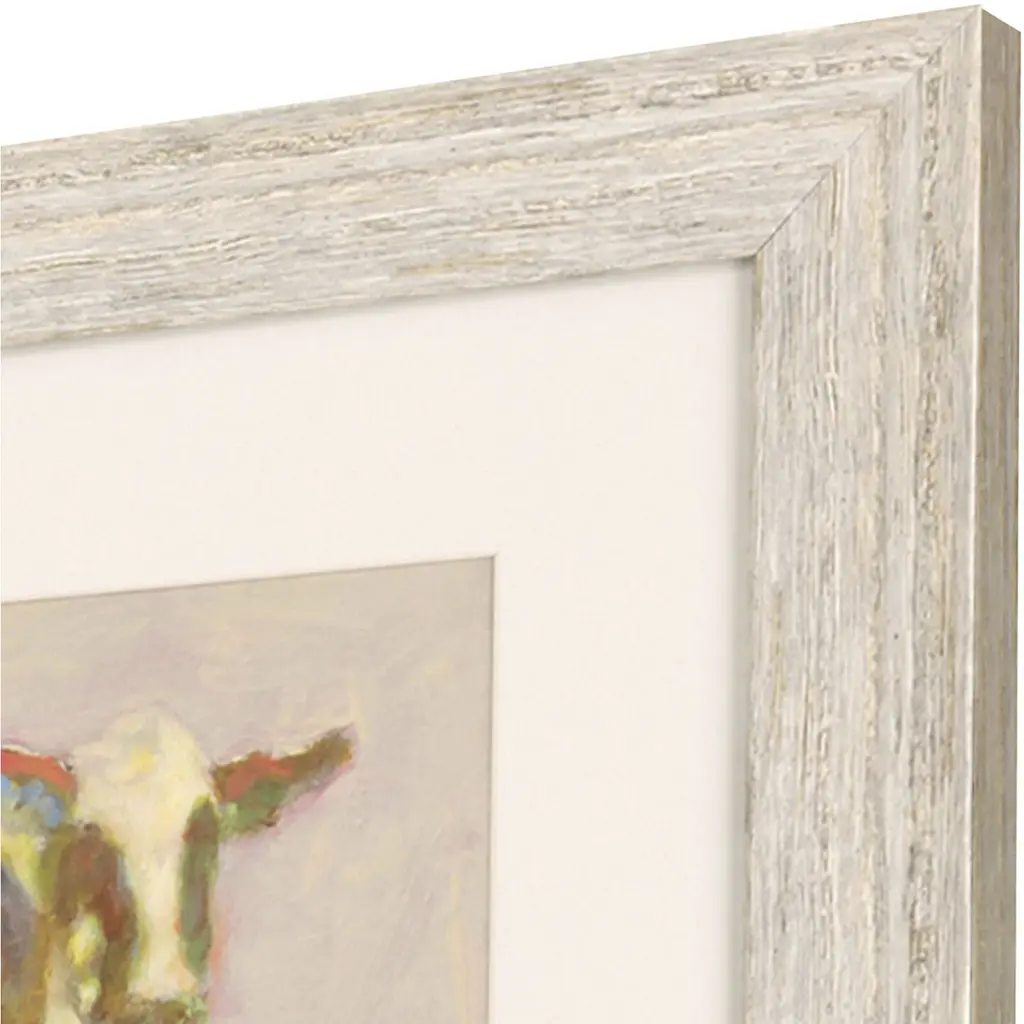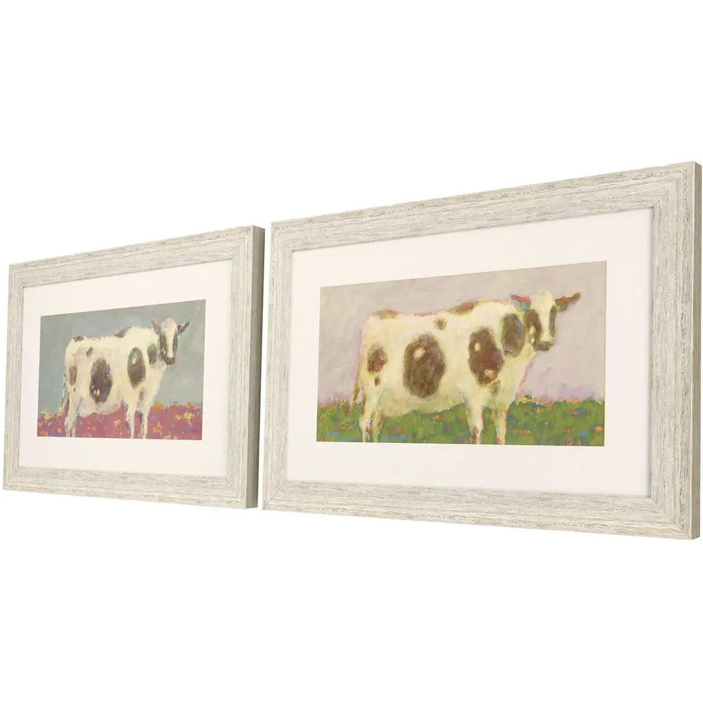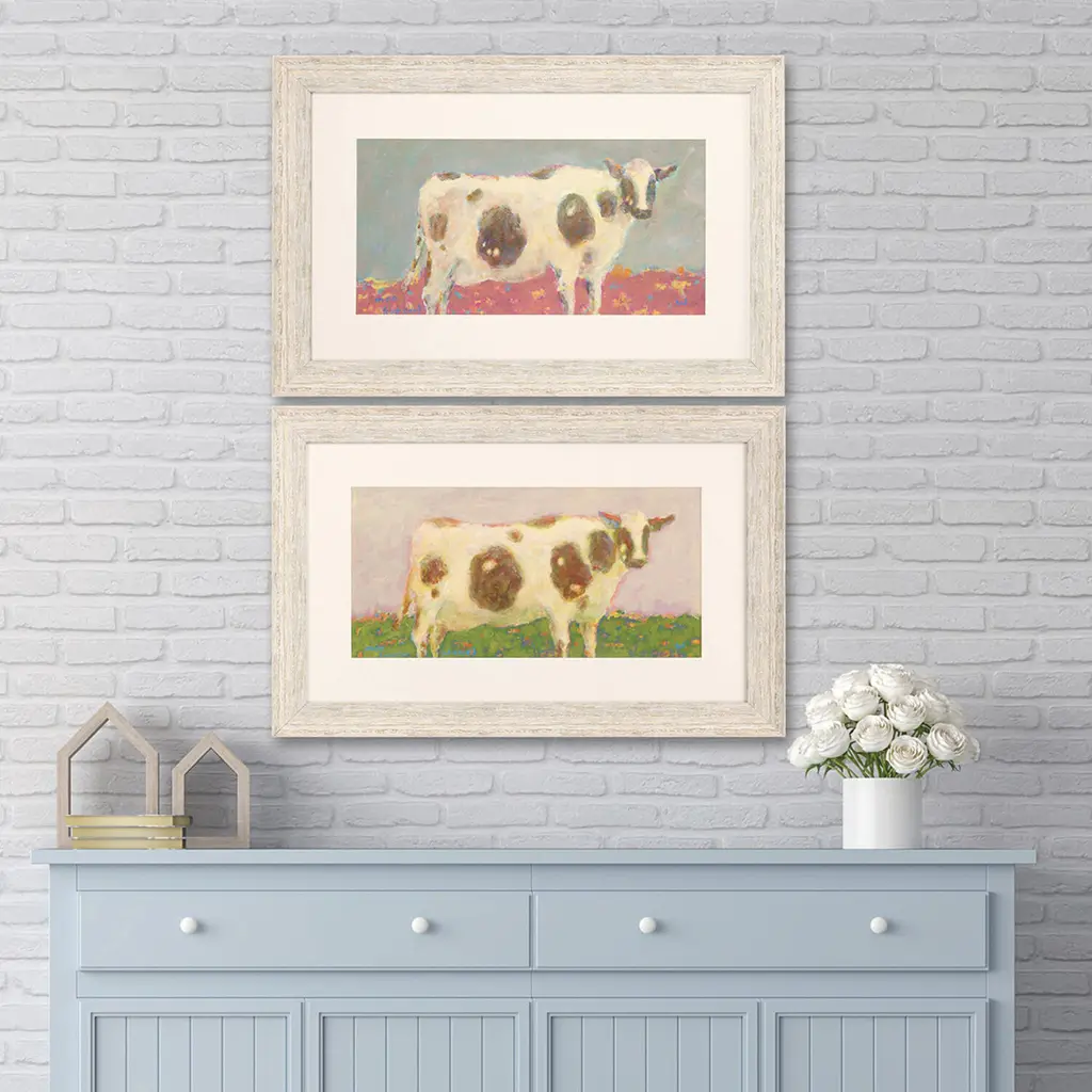A set of two cow images that are accentuated with a mat. These pieces are framed under glass and paired with a white washed textured frame.