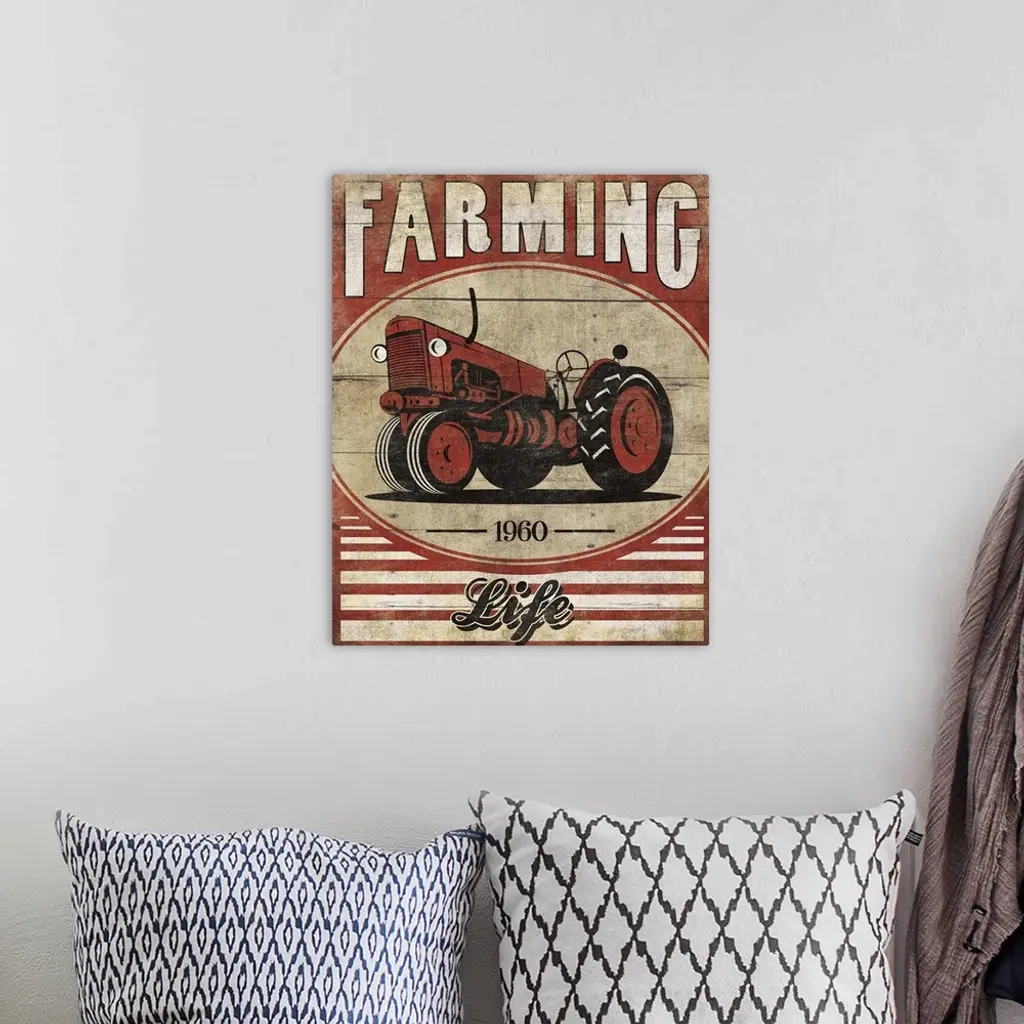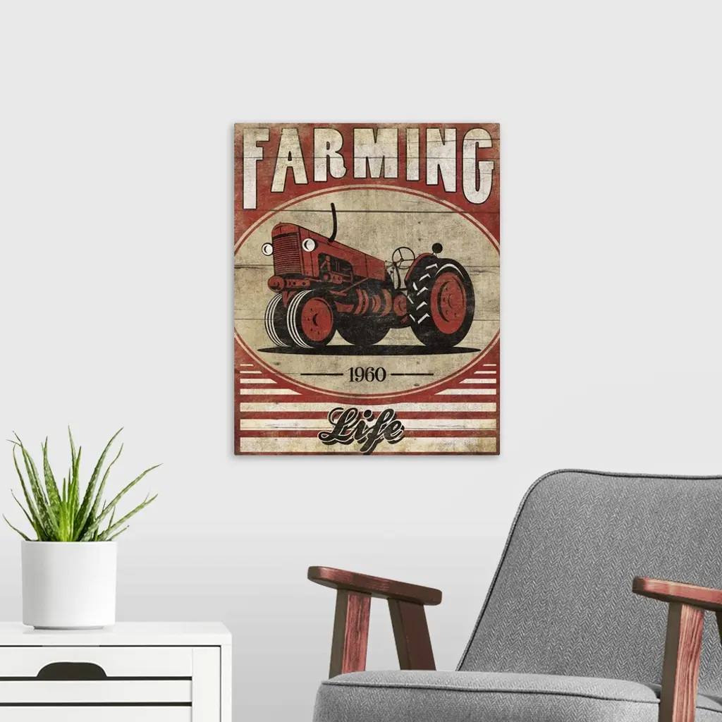 Vintage weathered, rustic looking sign, with a red tractor and the text "Farming" above it.