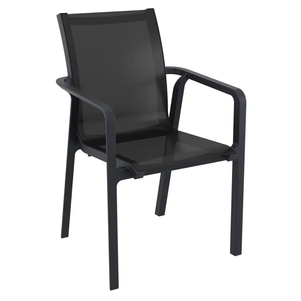 Two-person armchair bistro set with a 24-inch folding table. Armchairs have a sling back and seats. Comfortable and cool for hot summer days. Great for a balcony, patio, or deck.