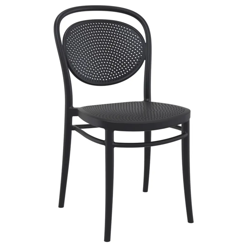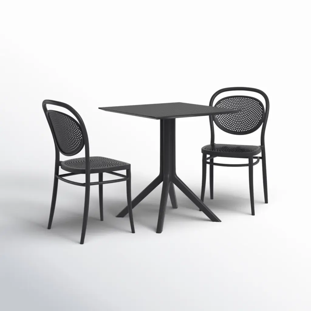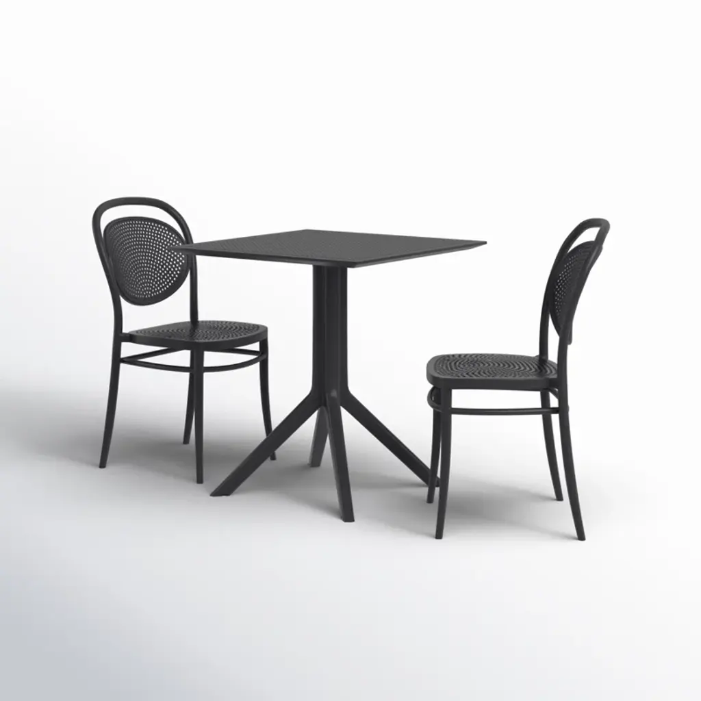 Two person dining set with a 27.5 inch dining table. Ideal for smaller outdoor spaces like balconies, terraces, decks, patios, this dining set is both practical and stylish. The polypropylene resin construction means it is easy to clean and maintain, and the compact size and stacking feature makes it easy to move around and store when not in use.