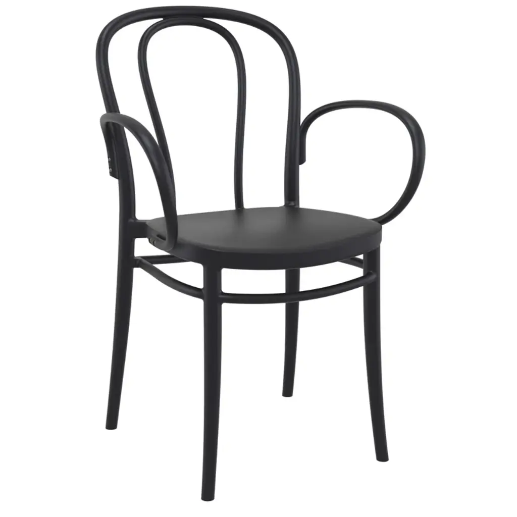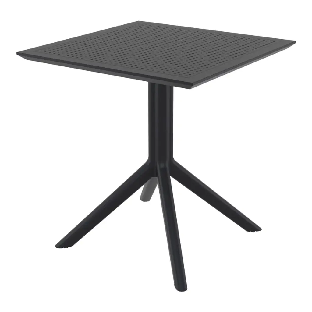 Two-person dining set with a 27.5-inch dining table. Ideal for smaller outdoor spaces like balconies, terraces, decks, and patios, this dining set is both practical and stylish. The polypropylene resin construction means it is easy to clean and maintain, and the compact size and stacking feature makes it easy to move around and store when not in use.