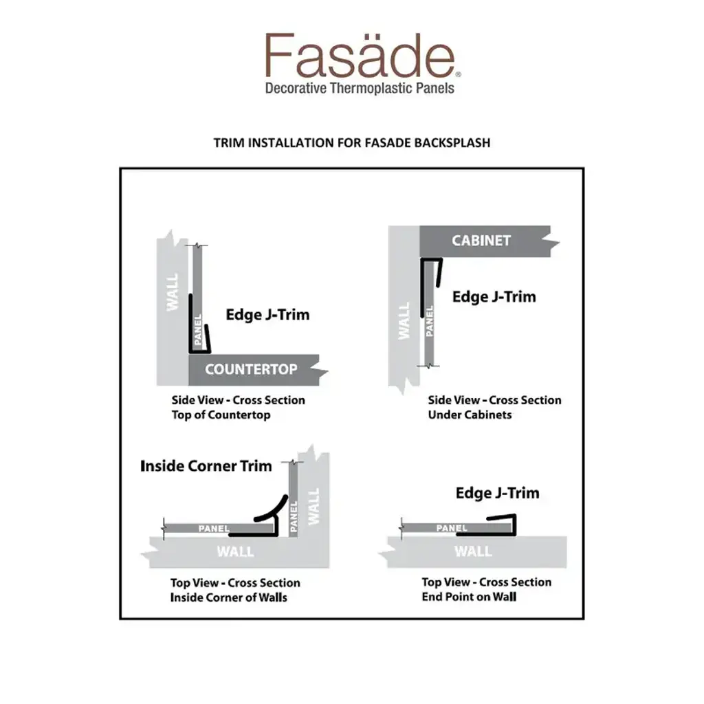 The Fasade Accessory Kit contains everything you'll need to complete your Fasade Backsplash project. With the components included in this kit, not only can you hide the cut edges of your backsplash panels, or finish the end of a run of backsplash, you'll also be giving your project that polished, professional look it deserves! The kit components feature PVC construction for great durability as well as the benefit of easy installation. The Fasade Accessory Kit offers a simple way to help coordinate a new look for your home.