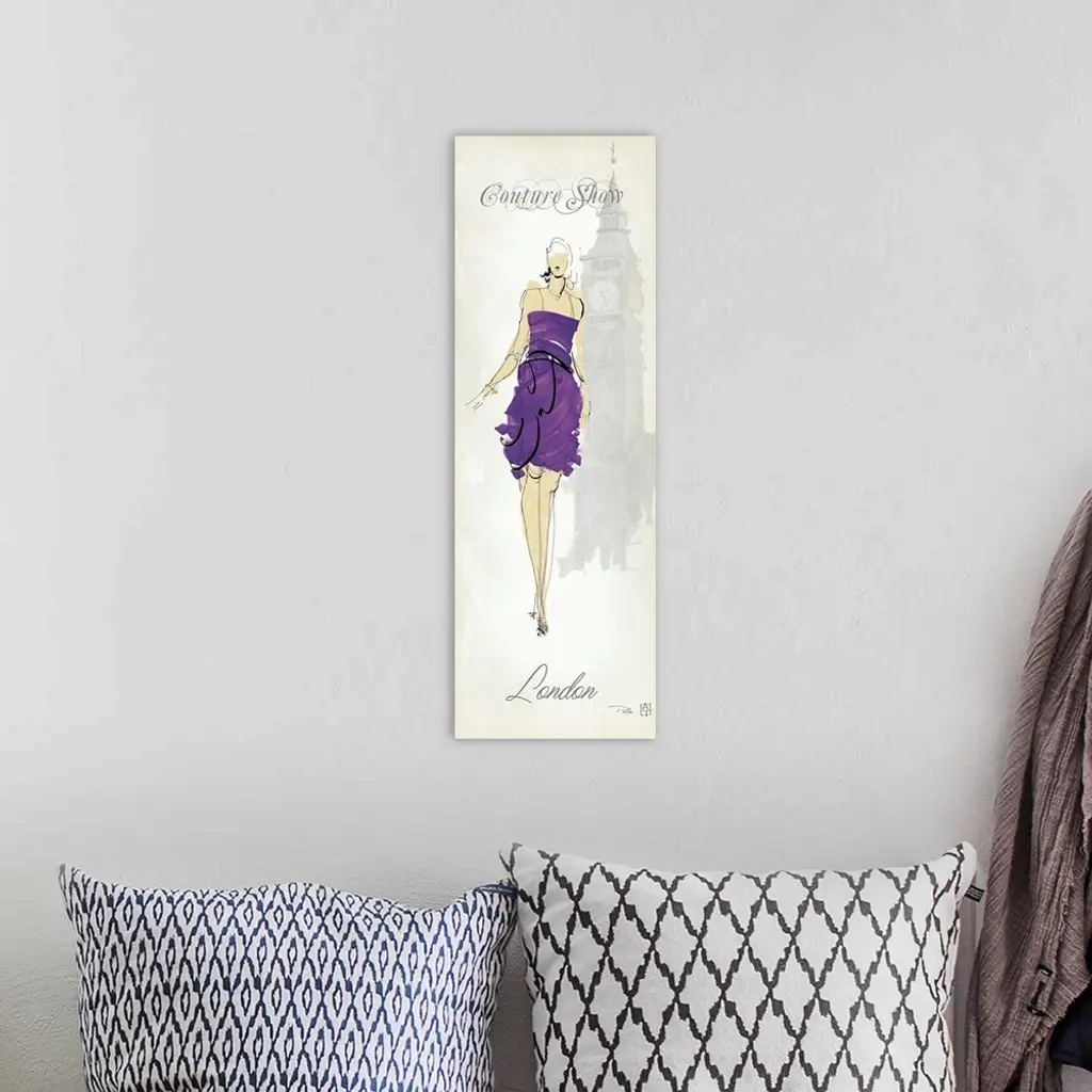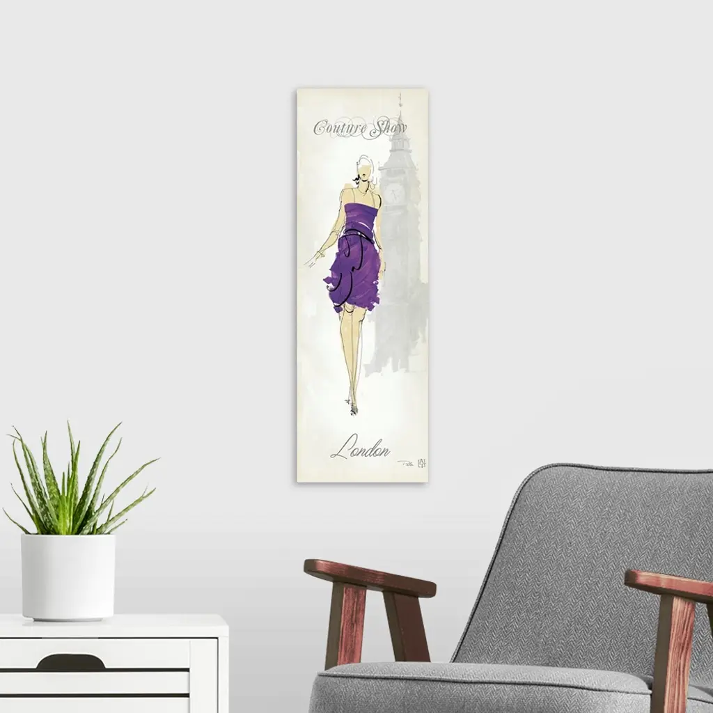 Vertical panoramic illustration of model with clock tower in background and the text "Couture Show" and "London."