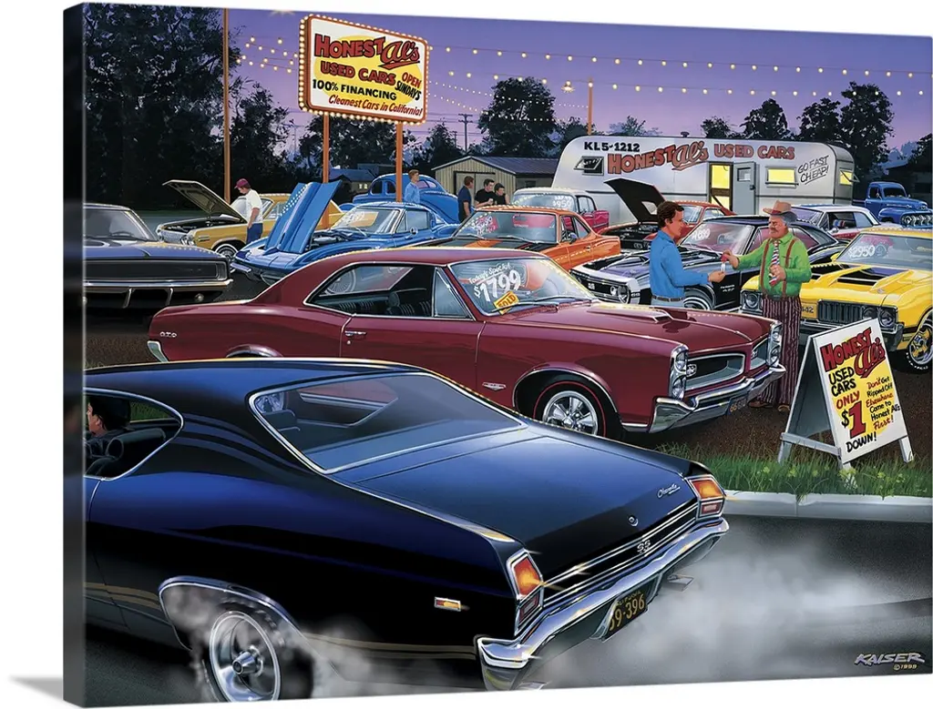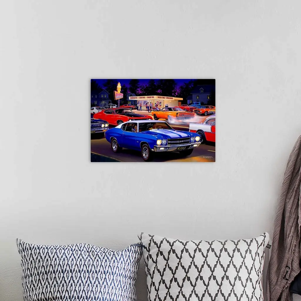 Big automotive art portrays a group of people enjoying the treats from a local snack shack. Filling the parking lot and streets are a larger number of muscle cars that include a 1970 Chevrolet Chevelle SS, 1955 Chevrolet, 1964 Plymouth, and a 1970 Ford Torino Cobra Jet.