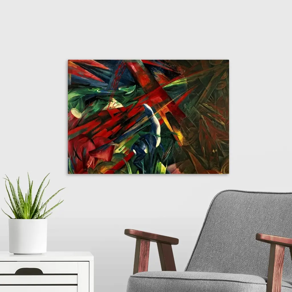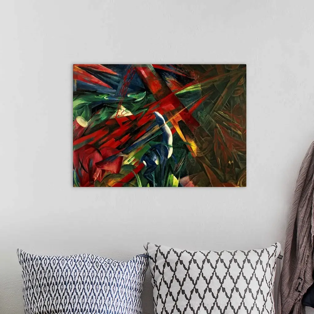 Giant abstract art includes a collage of different wildlife ranging from horses to foxes. Artist uses a lot of sharp lines and vibrant colors to construct this piece.