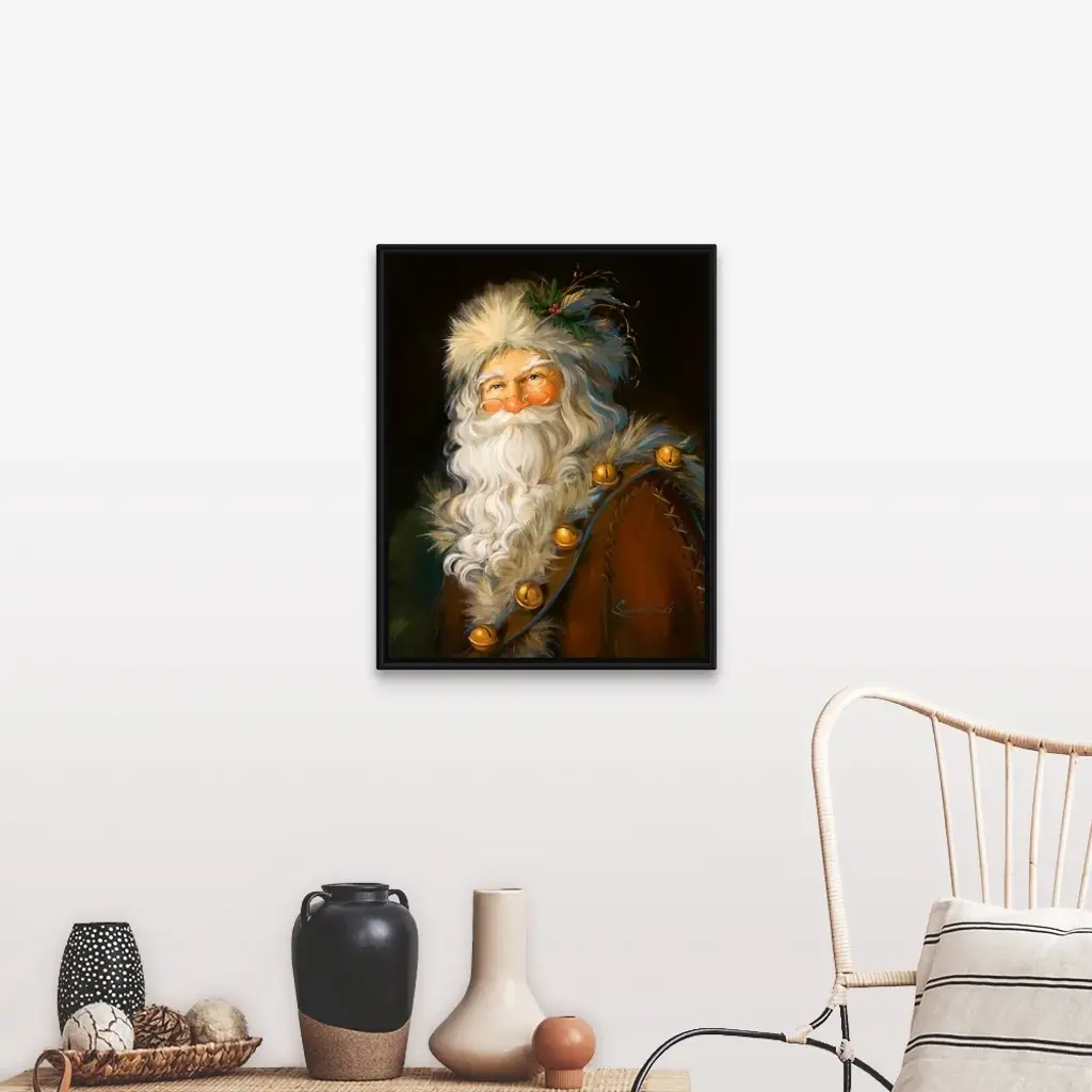 Floating Frame Canvas Wall Art with Black Frame entitled 'Father Christmas'. Fine art painting of Santa Claus wearing a fur hat and jacket. Multiple sizes available. Primary colors within this image include: Peach, Black, Brown, Muted Blue. Made in the USA. All products come with a 365 day workmanship guarantee. Archival-quality UV-resistant inks.