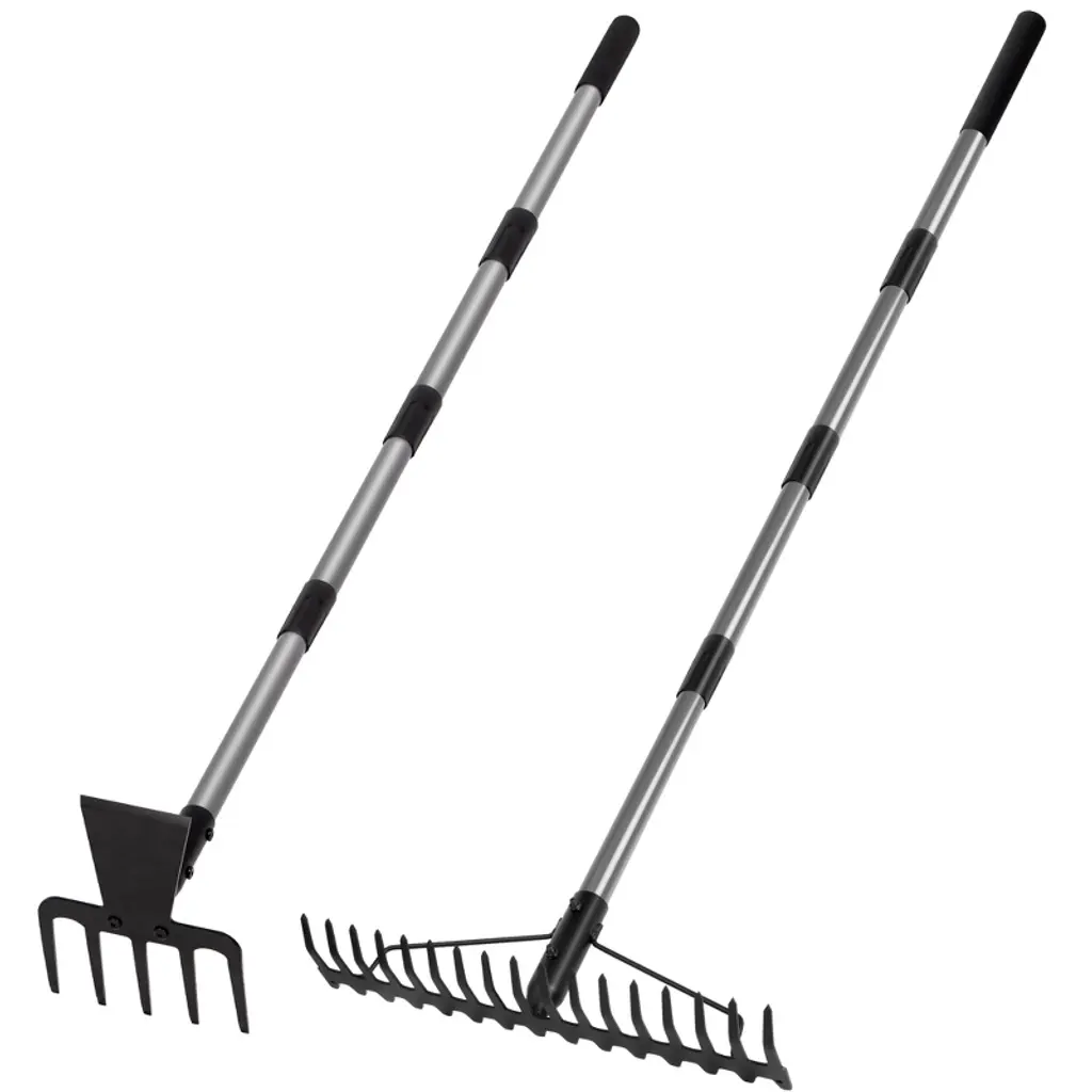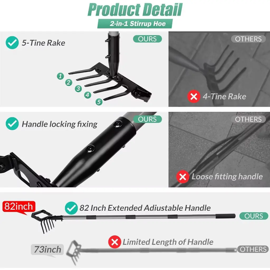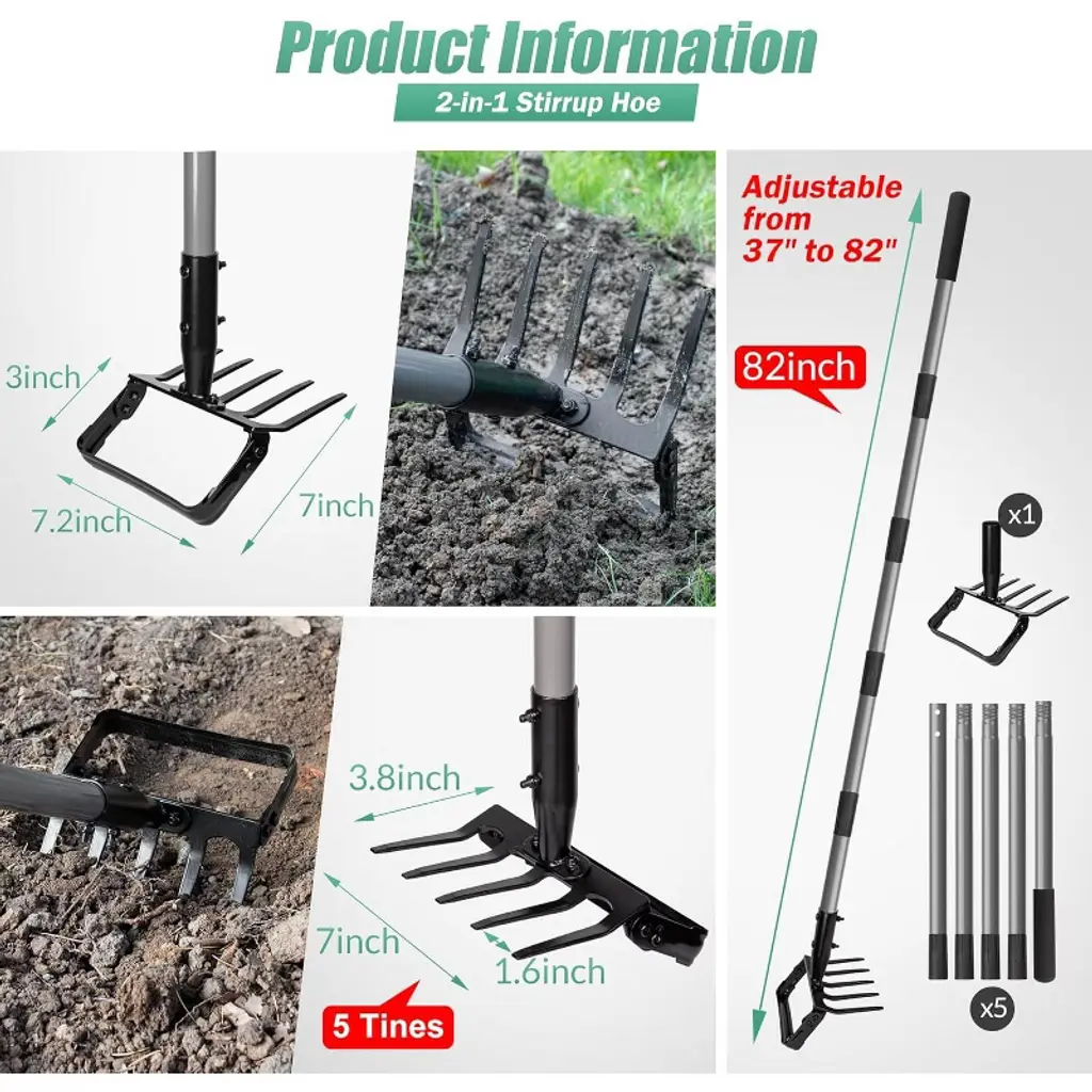 This 2-in-1 adjustable garden tool combines a heavy-duty stirrup hoe and 5-tine cultivator in one, with a rust-proof metal head and 37"-82" telescoping handle to eliminate back strain. Perfect for weeding, soil loosening and planting, it assembles in minutes and comes with a satisfaction.