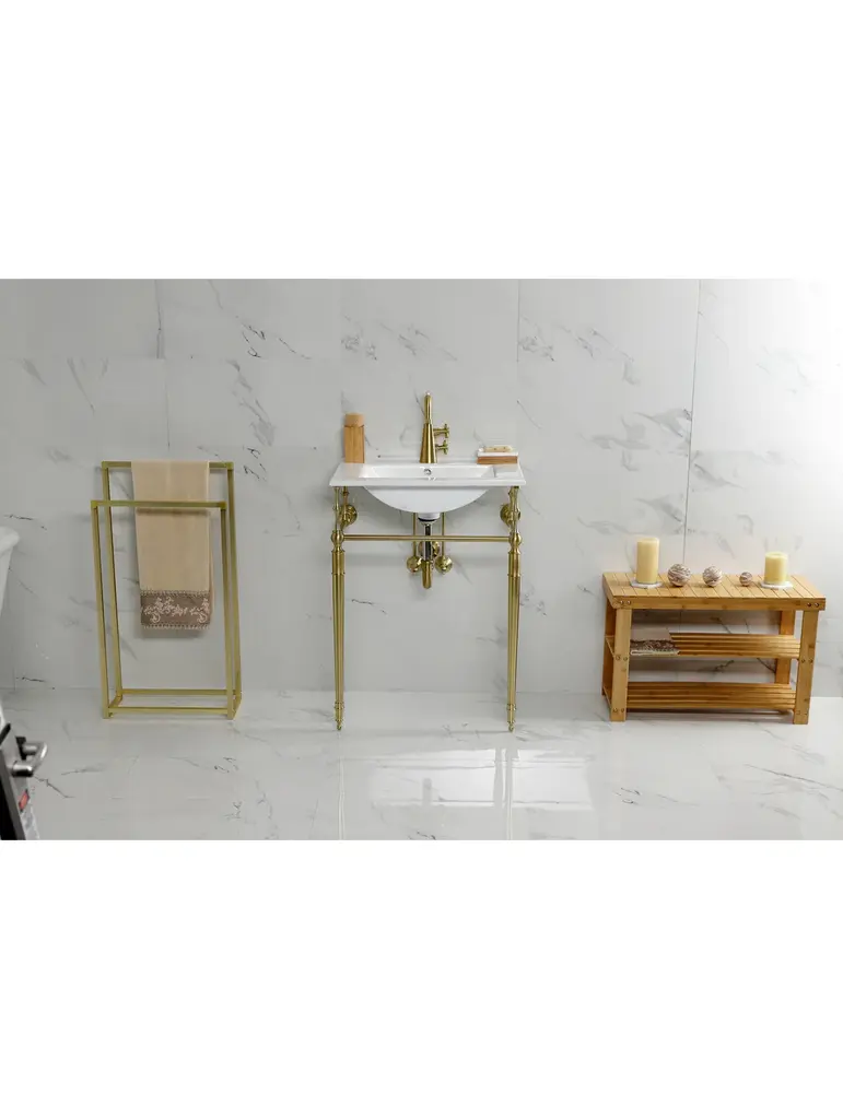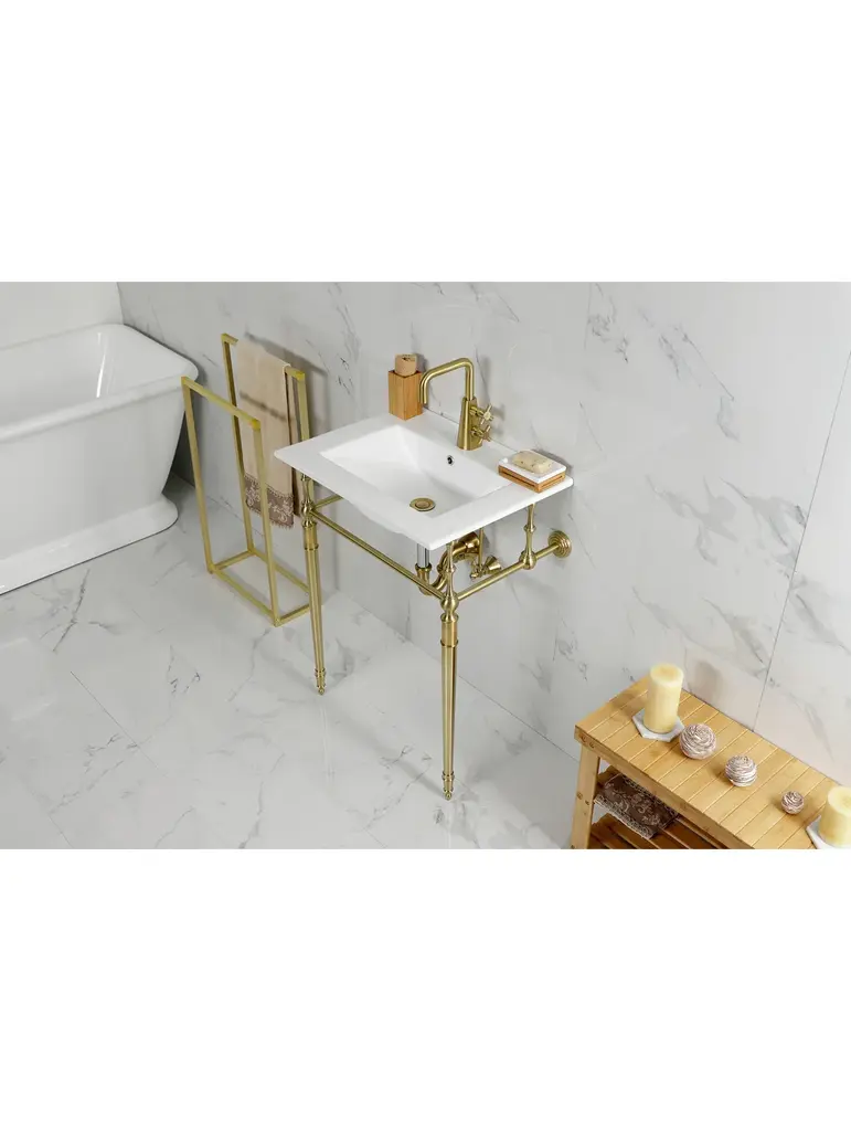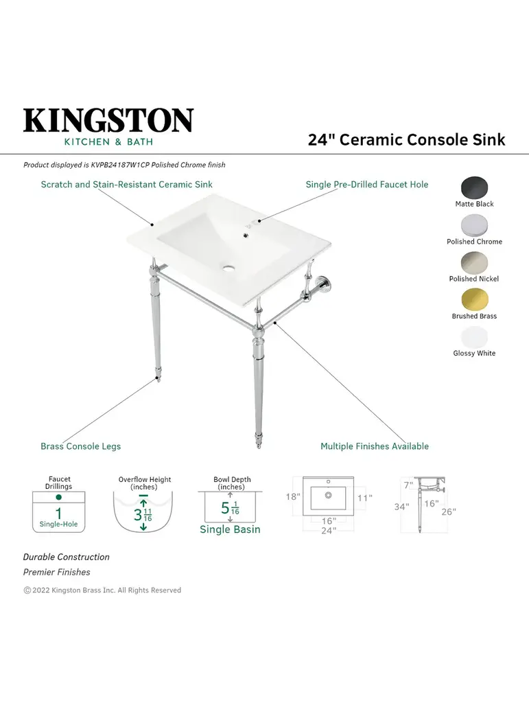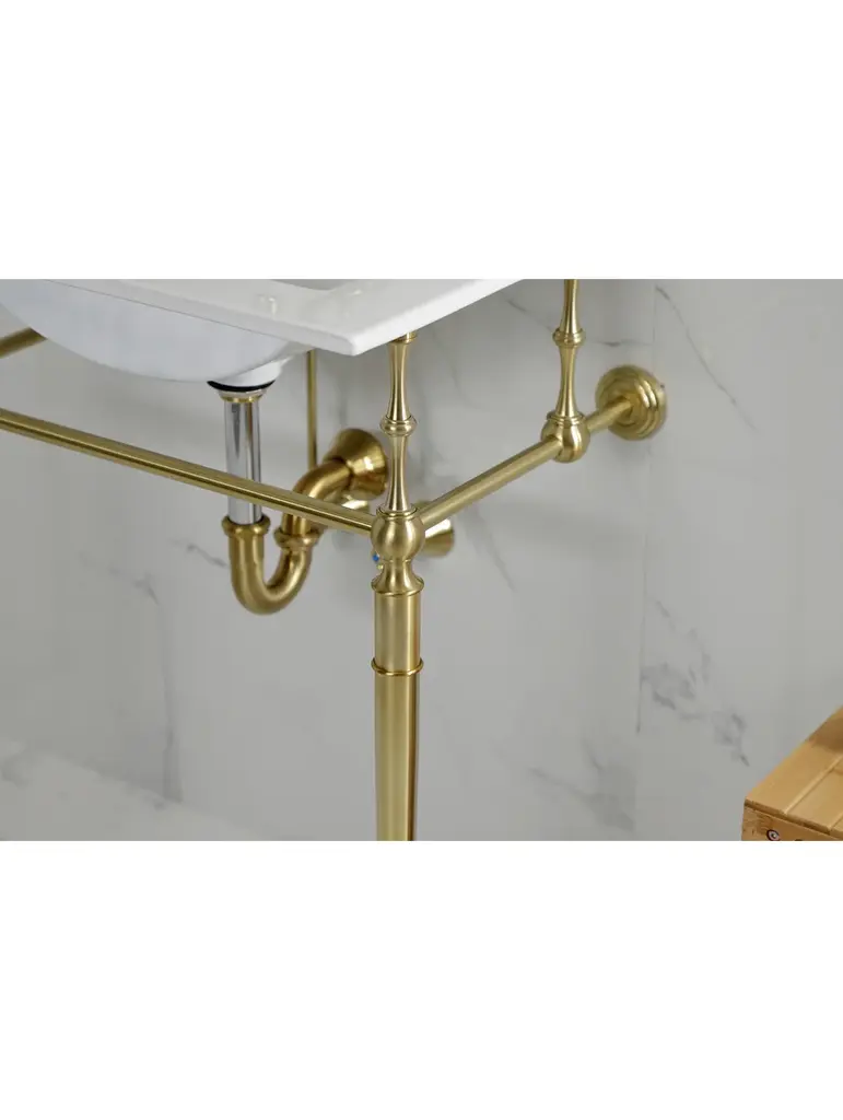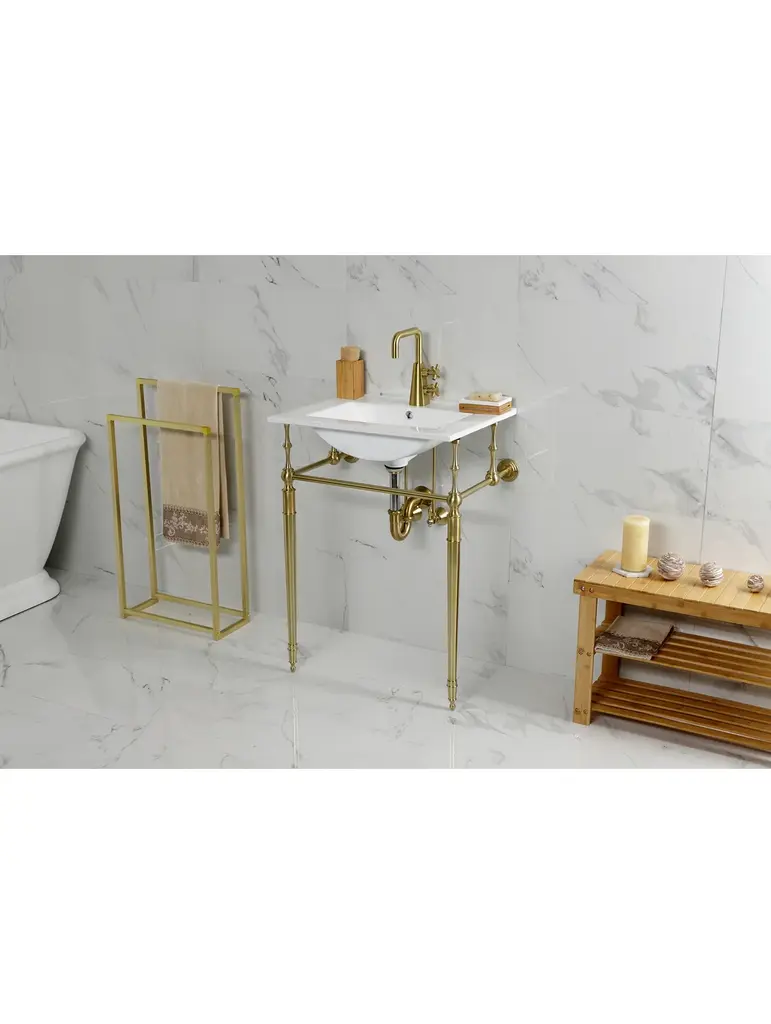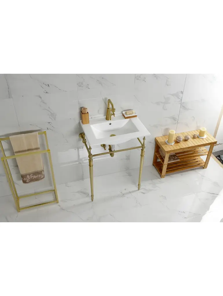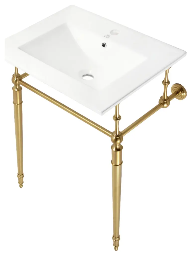 With a beautiful ceramic counter top, this console sink set is a long lasting, durable, and elegant addition to your bathroom. A fabulous alternative where space is limited or tight, making them friendly for the whole family. The pristine, stain-resistant surface and glistening finish make for a very sturdy fixture that is easily maintained. Also for your convenience, anti-slip rubber pads are included with the brass legs to ensure steadiness. Water supply kit, drain assembly, and the faucet are sold separately.Base is constructed of solid brassIncludes a ceramic top with integral basinSink top is pre-drilled to accommodate single-hole faucetOverall size: (L)24" x (W)18-5/16" x (H)33-3/4"Basin size: (L)16-7/16" x (W)10-5/8" x (H)5-1/16"Water supply kit and drain sold separatelyTopside of vanity top glazed glossy whiteUnderside of vanity top unglazed, sealed with matte white protective coatingProfessional installation recommendedDesigned for long-lasting durabilityConsole sink installation