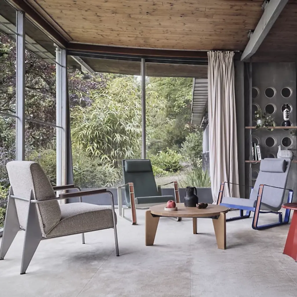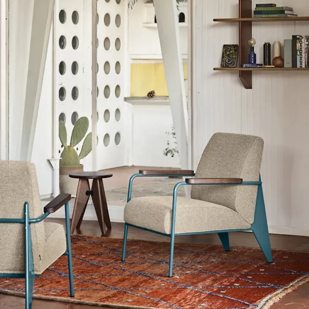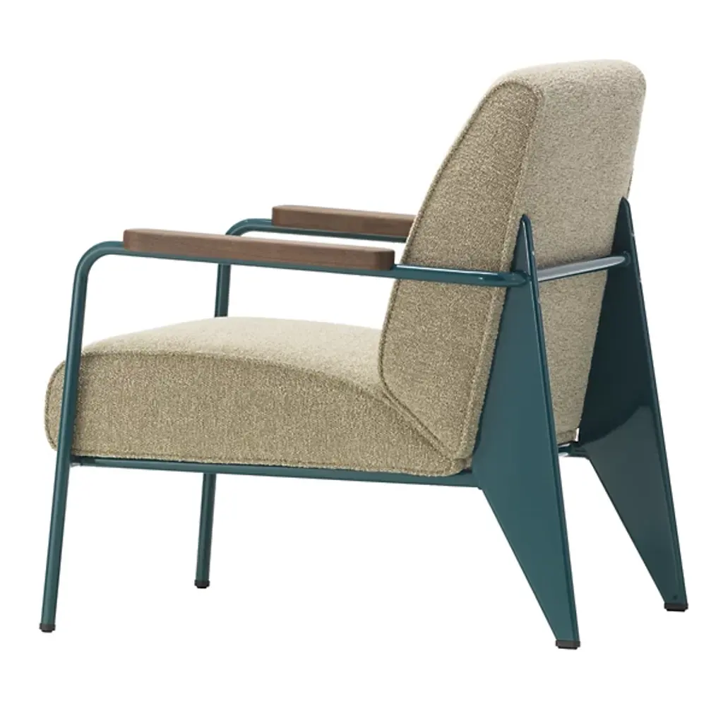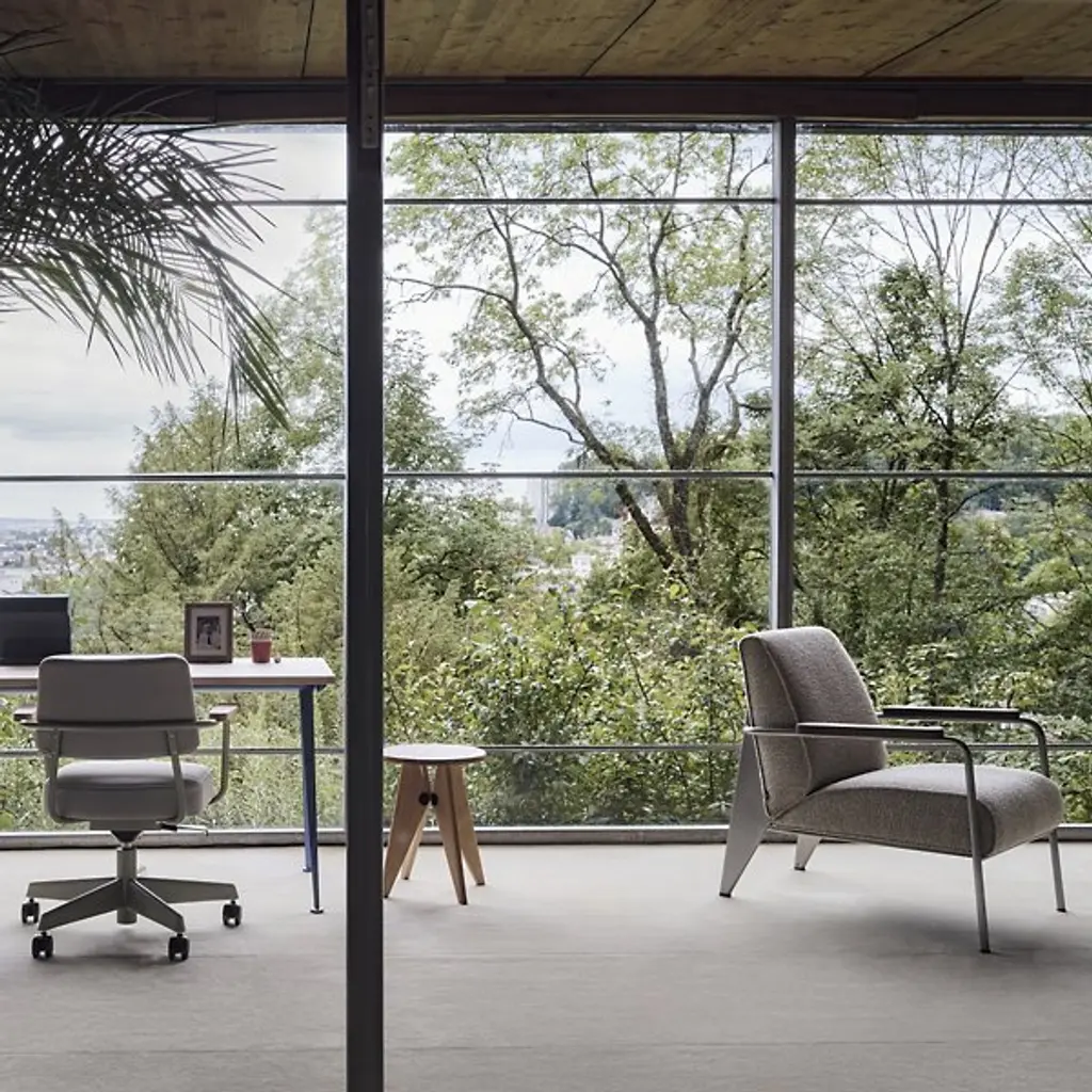 The Fauteuil de Salon from Vitra is a true mainstay, continuing to arrest visually through its sweeping contours and comfort with ample support since its inception in 1939. Creator Jean Prouve’s work finds a beautiful balance between his metalworking, design, and architectural background. Bent steel legs create a dramatic stance out of sharp triangles. Steel rods flow from them to create a seamless armrest and front leg combo. Low-profile wood bars lay on the armrests with beautiful grain accents. The back and seatrest nestles inside as smooth, tapered forms. Their cushions and fine upholstery combine for a blissful state while lounging.