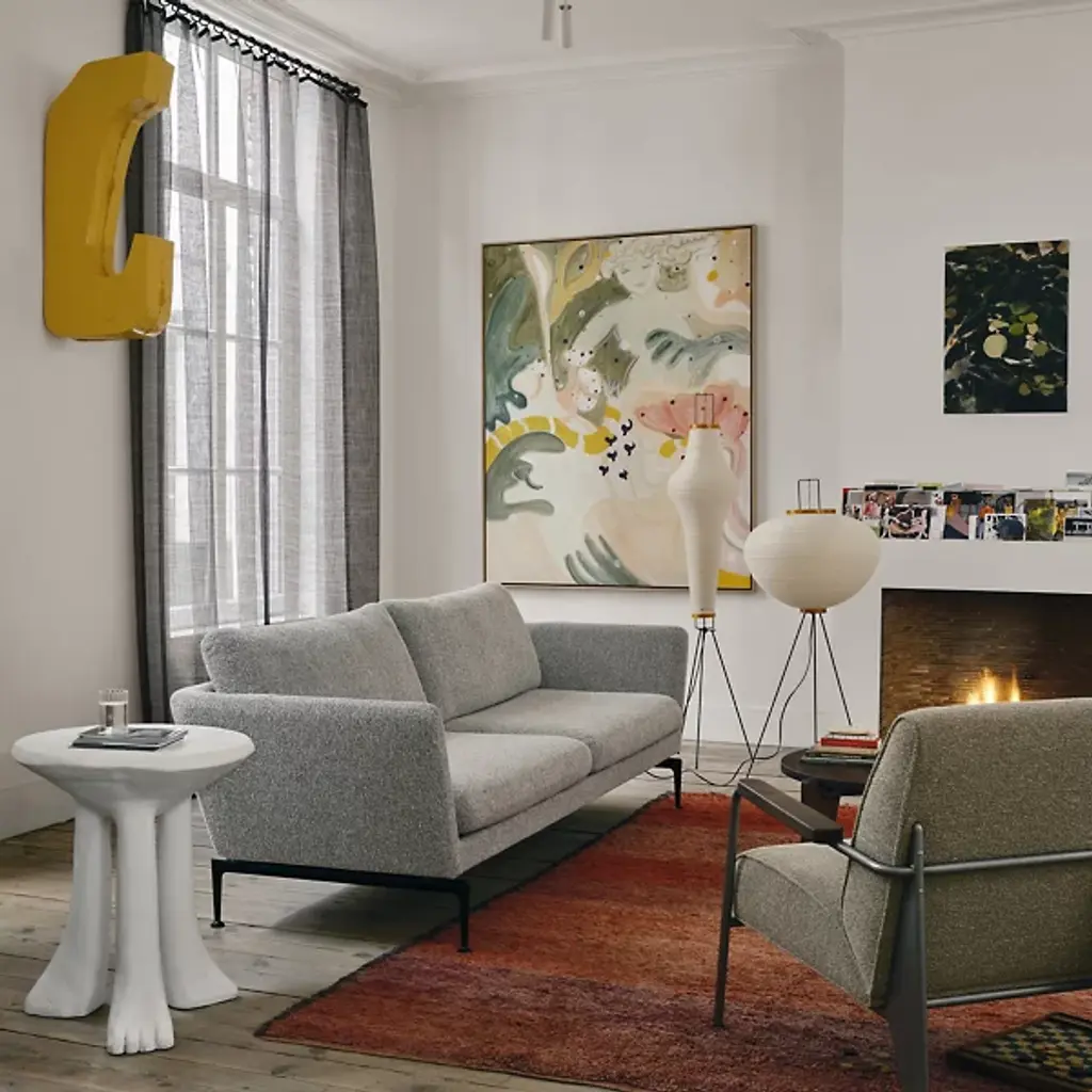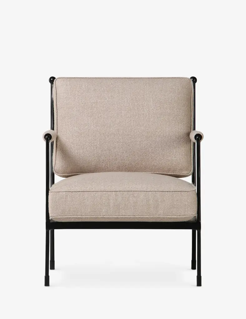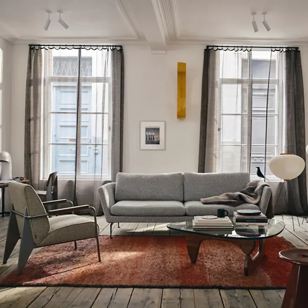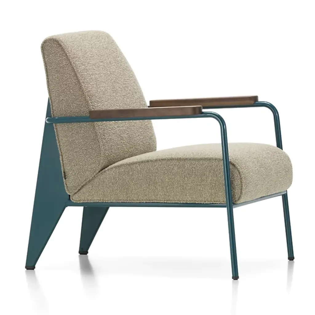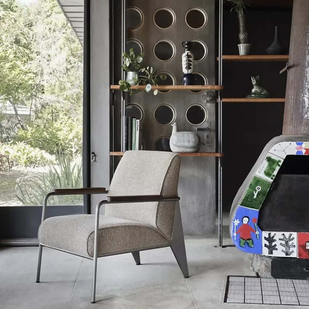 The Fauteuil de Salon from Vitra is a true mainstay, continuing to arrest visually through its sweeping contours and comfort with ample support since its inception in 1939. Creator Jean Prouve’s work finds a beautiful balance between his metalworking, design, and architectural background. Bent steel legs create a dramatic stance out of sharp triangles. Steel rods flow from them to create a seamless armrest and front leg combo. Low-profile wood bars lay on the armrests with beautiful grain accents. The back and seatrest nestles inside as smooth, tapered forms. Their cushions and fine upholstery combine for a blissful state while lounging.