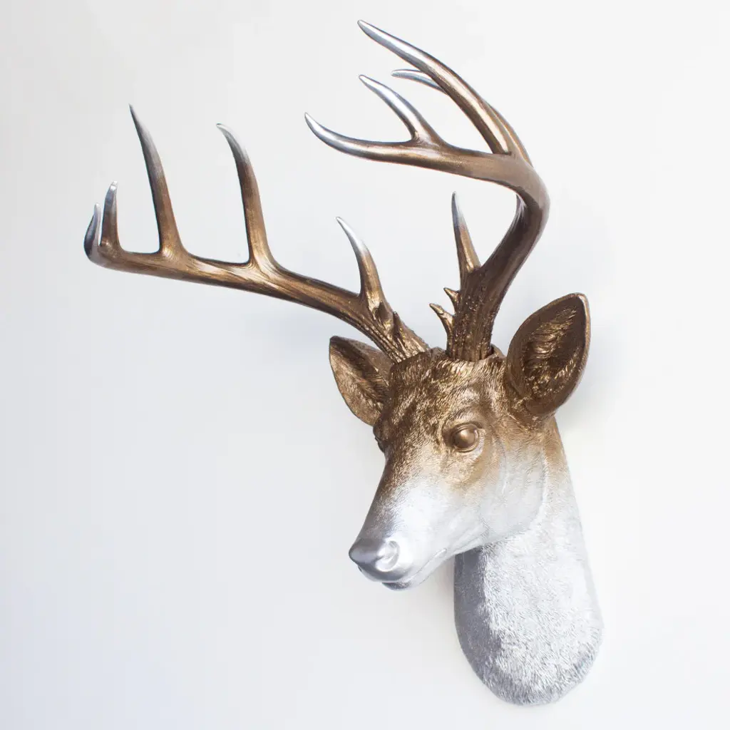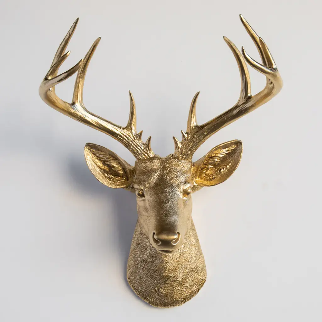Create an eclectic gallery wall with the Point Stag Wall-Mount Faux Deer Bust With Antlers from Near and Deer. Less menacing than the real thing, the Point Stag features a contemporary finish for a trendy addition to your space. The Near and Deer brand seeks to revamp and develop traditional decor conventions to push the boundaries of a modern look.Faux deer bust with 14-point antlersColor: GoldMaterial: ResinDimensions: W 18.25" x D 13" x H 21"