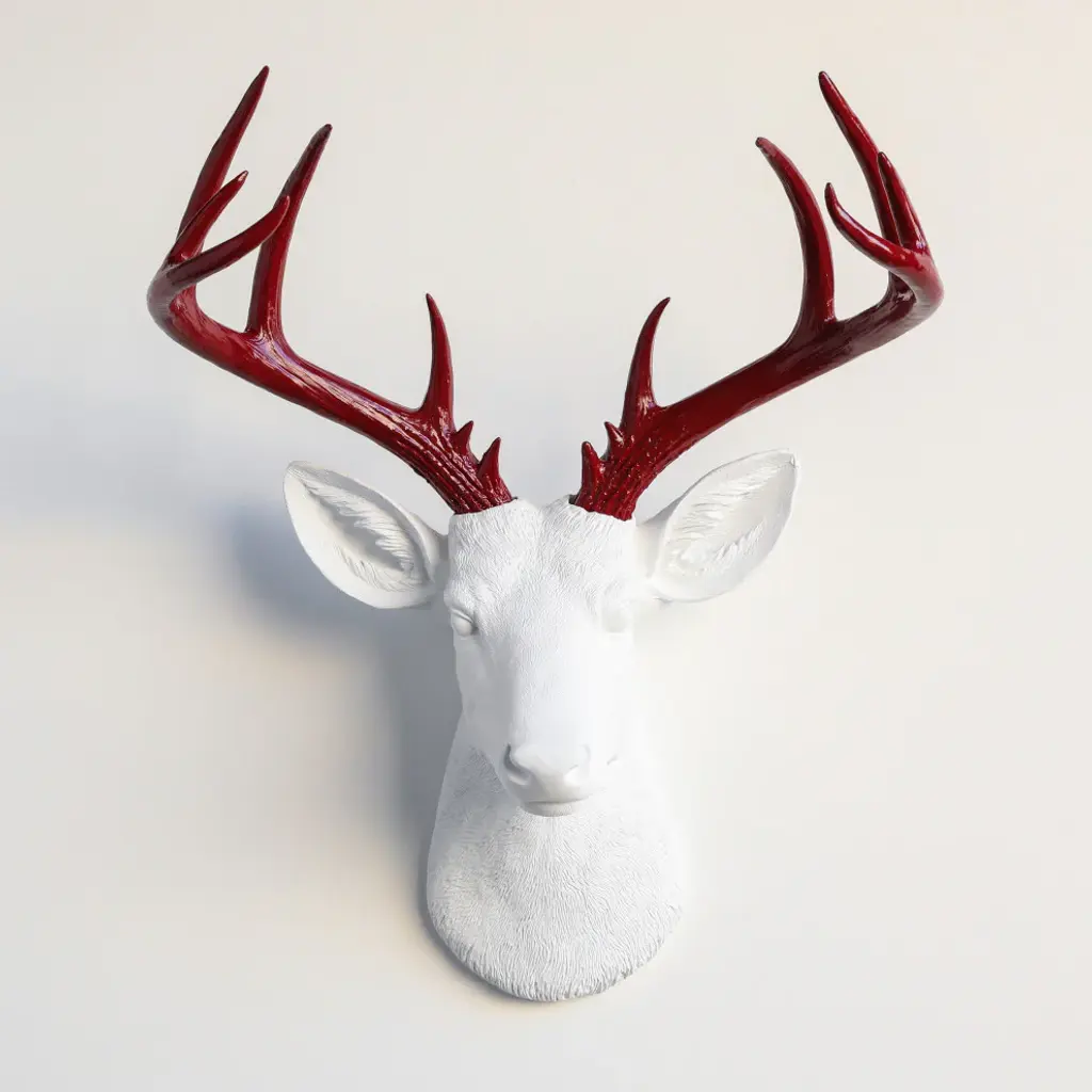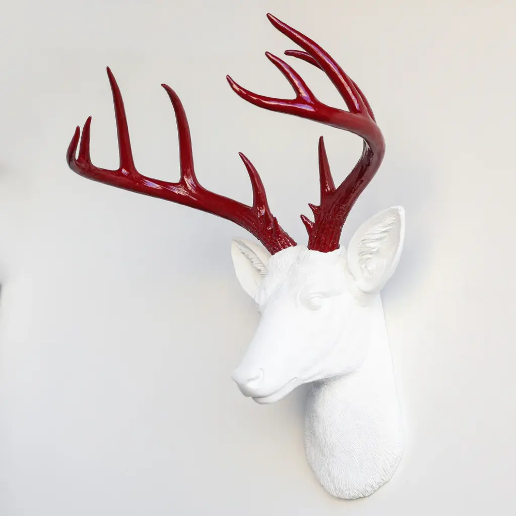 Faux Deer Head Wall Mount 14 Point Stag Head Antlers, White And Red