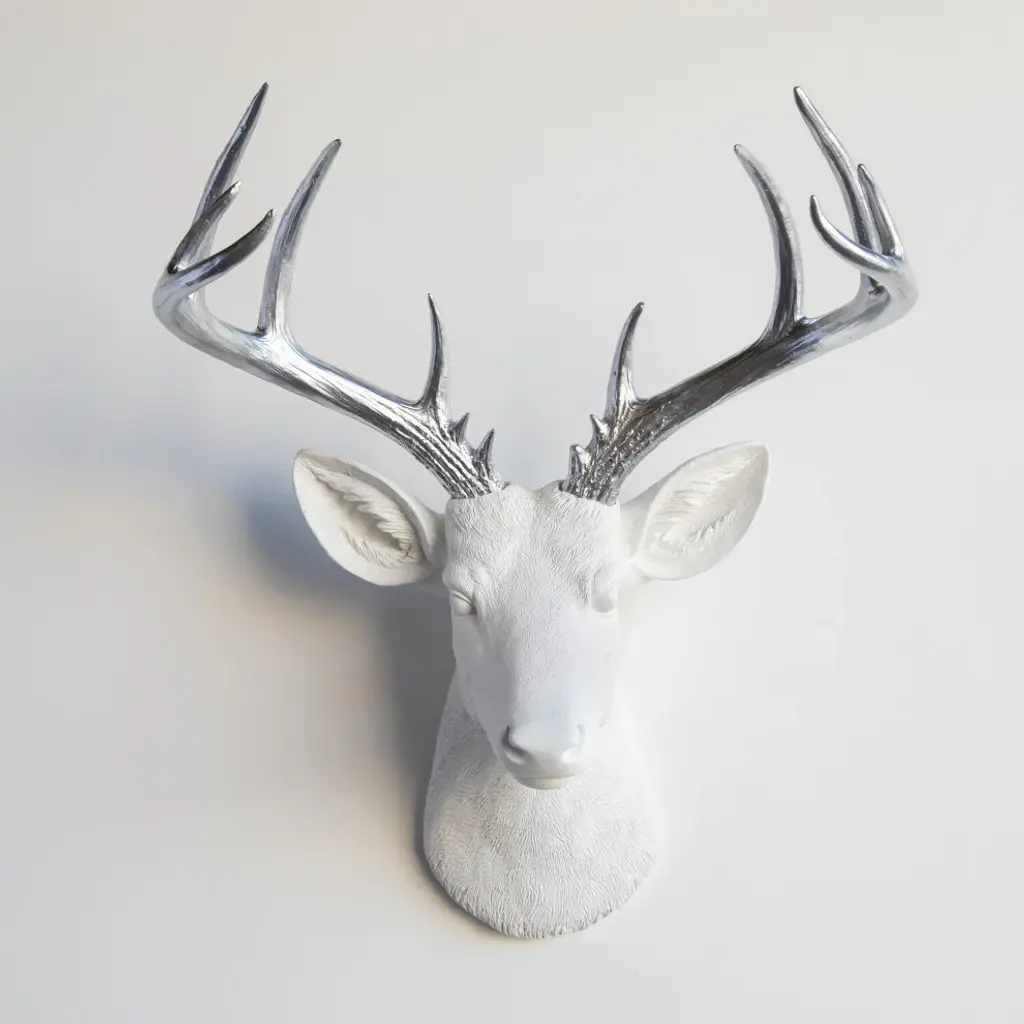 Create an eclectic gallery wall with the Point Stag Wall-Mount Faux Deer Bust With Antlers from Near and Deer. Less menacing than the real thing, the Point Stag features a contemporary finish for a trendy addition to your space. The Near and Deer brand seeks to revamp and develop traditional decor conventions to push the boundaries of a modern look.Faux deer bust with 14-point antlersColor: Material: ResinDimensions: W 18.25" x D 13" x H 21"