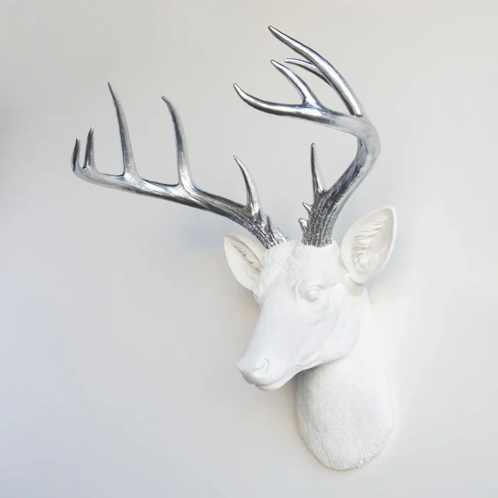 Faux Deer Head Wall Mount - 14 Point Stag Head Antlers, White And Silver